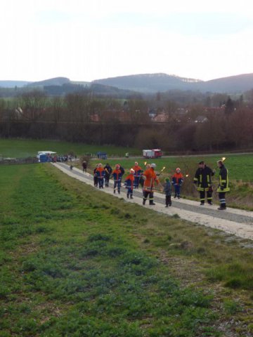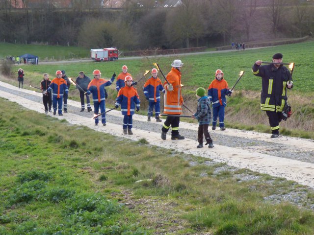 Um 19.30 Uhr startete die Jugendfeuerwehr mit ihrem alljährliche Fackelzug zum Osterfeuerplatz "Auf den Hainholz" um das Feuer zu entzünden. Währenddessen wurden die Besucher mit Speis und Trank an der Nettequelle versorgt. Trotz der kalten Witterung waren wieder viele Gäste gekommen um sich bei herrlicher Sicht das Osterfeuer anzuschauen und sich in gemütlicher Atmosphäre untereinander auszutauschen.
