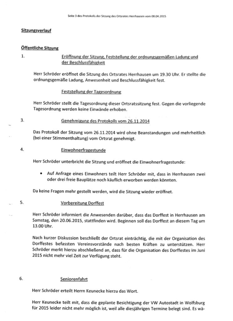 Protokoll über die Sitzung des Ortsrates Herrhausen am Mittwoch, dem 08.04.2015, 19:30 Uhr, in der Gaststätte "Zur Traube".