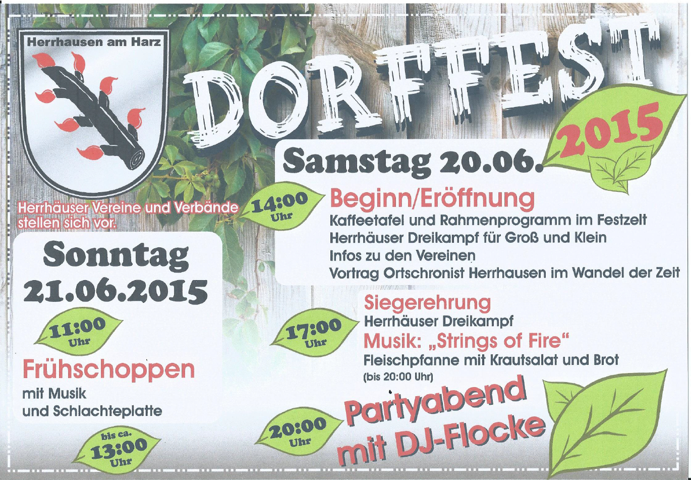 Die örtlichen Vereine und Verbände (Ortsrat, Ortsfeuerwehr, Schießclub, TSV, Gesangverein Harmonie-Liederkranz, DRK, Jagdhornbläser, SovD, Kirchengemeinde, Förderverein St.-Georg-Kirche und Angelsportverein) haben sich einmal mehr entschlossen ein Dorffest zu veranstalten. In diesem Jahr ein guter Grund, vor 40 Jahren entschlossen sich die Vereine und Verbände zum ersten Mal ein Dorffest zu feiern. Alle Einwohner des Dorfes und alle Interessierten von nah und fern sind hierzu herzlich eingeladen.