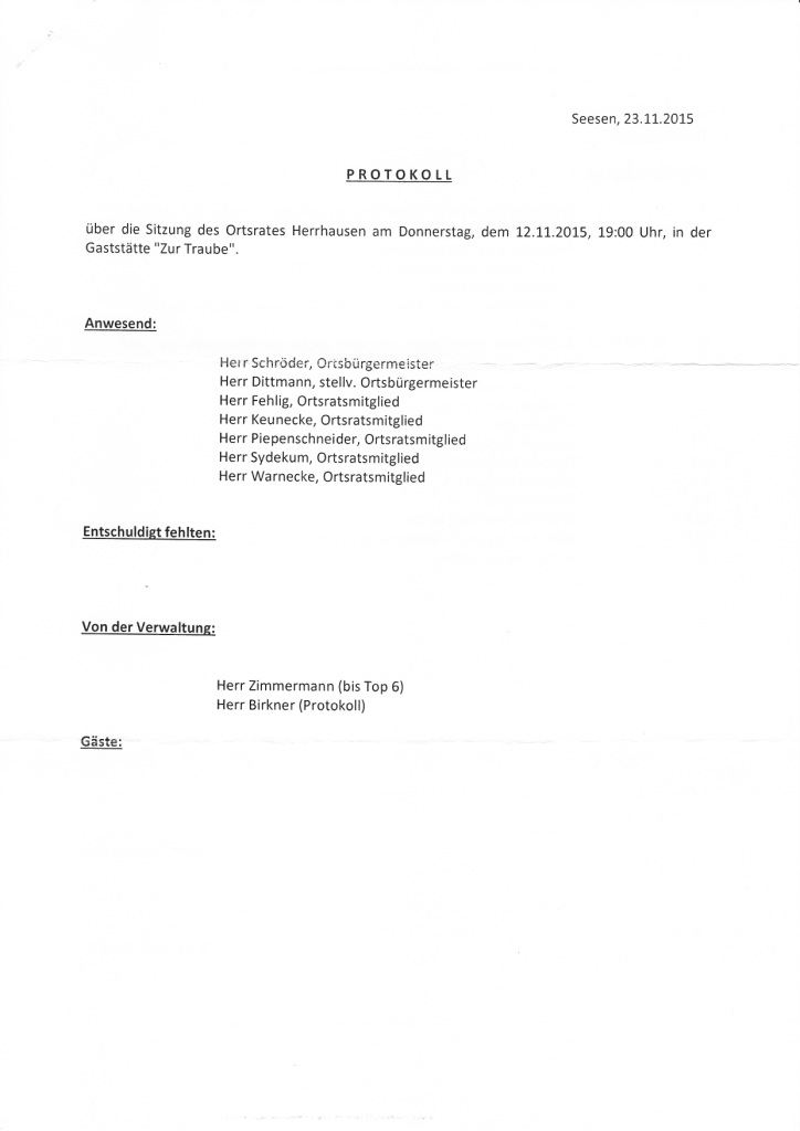 Protokoll über die Sitzung des Ortsrates Herrhausen am Donnerstag, dem 12.11.2015, 19:00 Uhr, in der Gaststätte "Zur Traube".