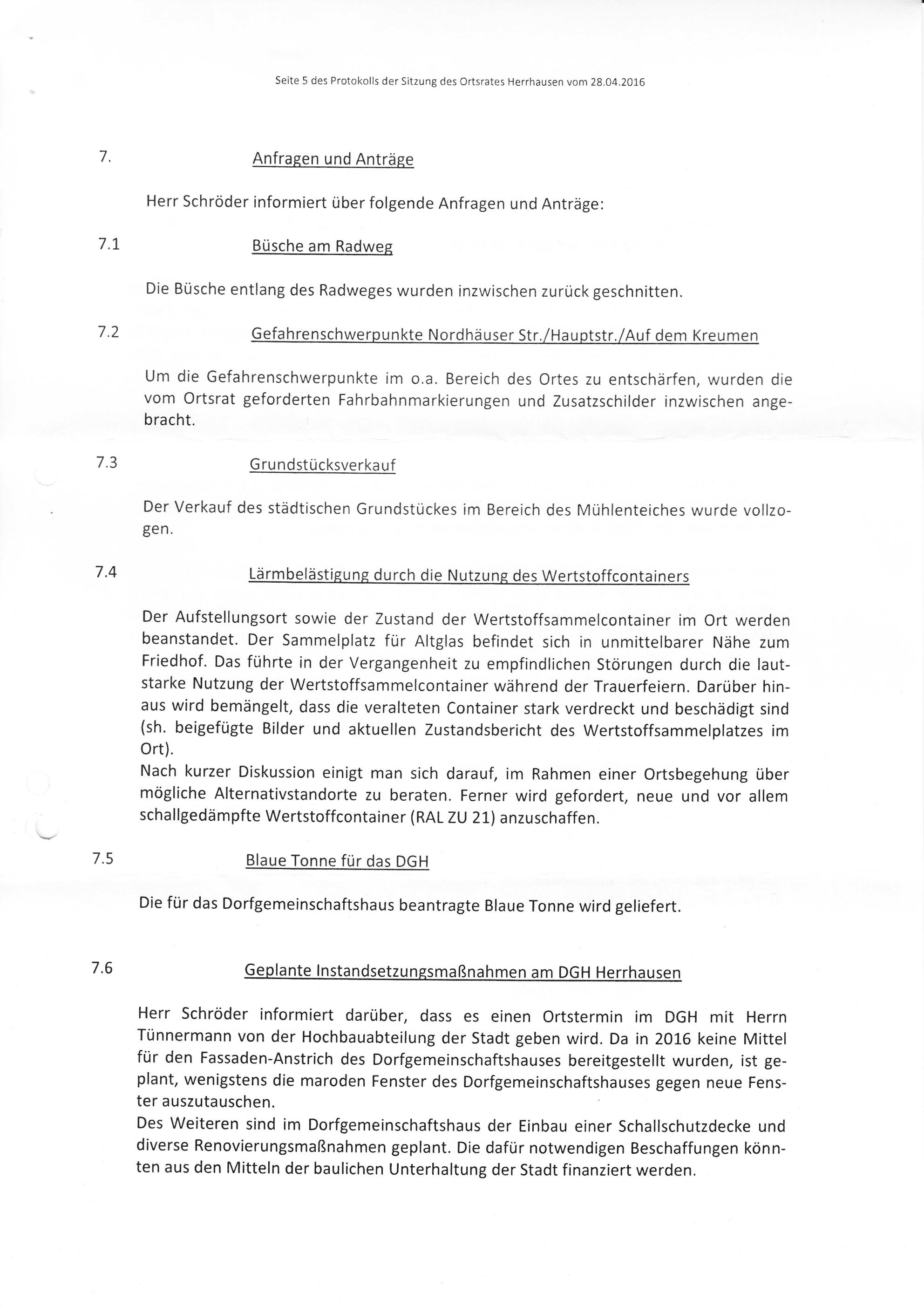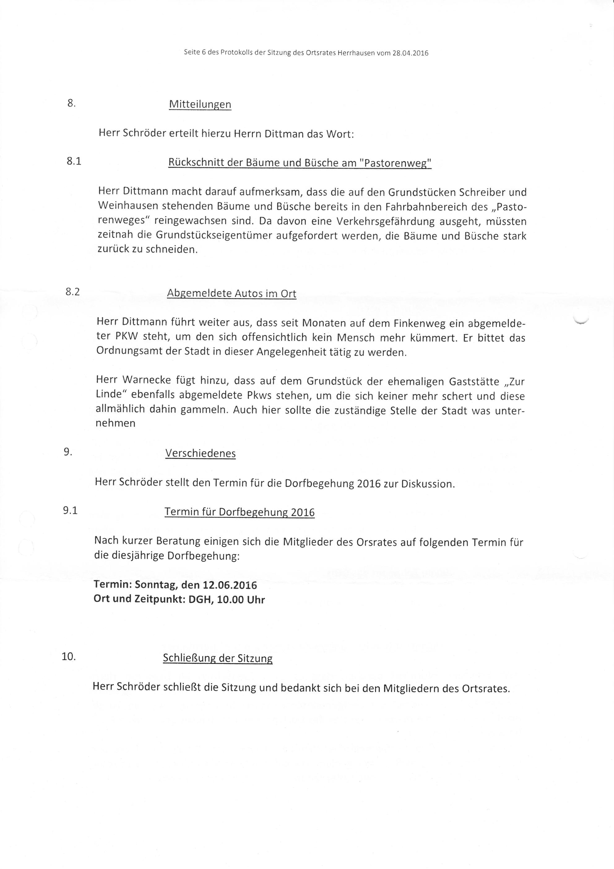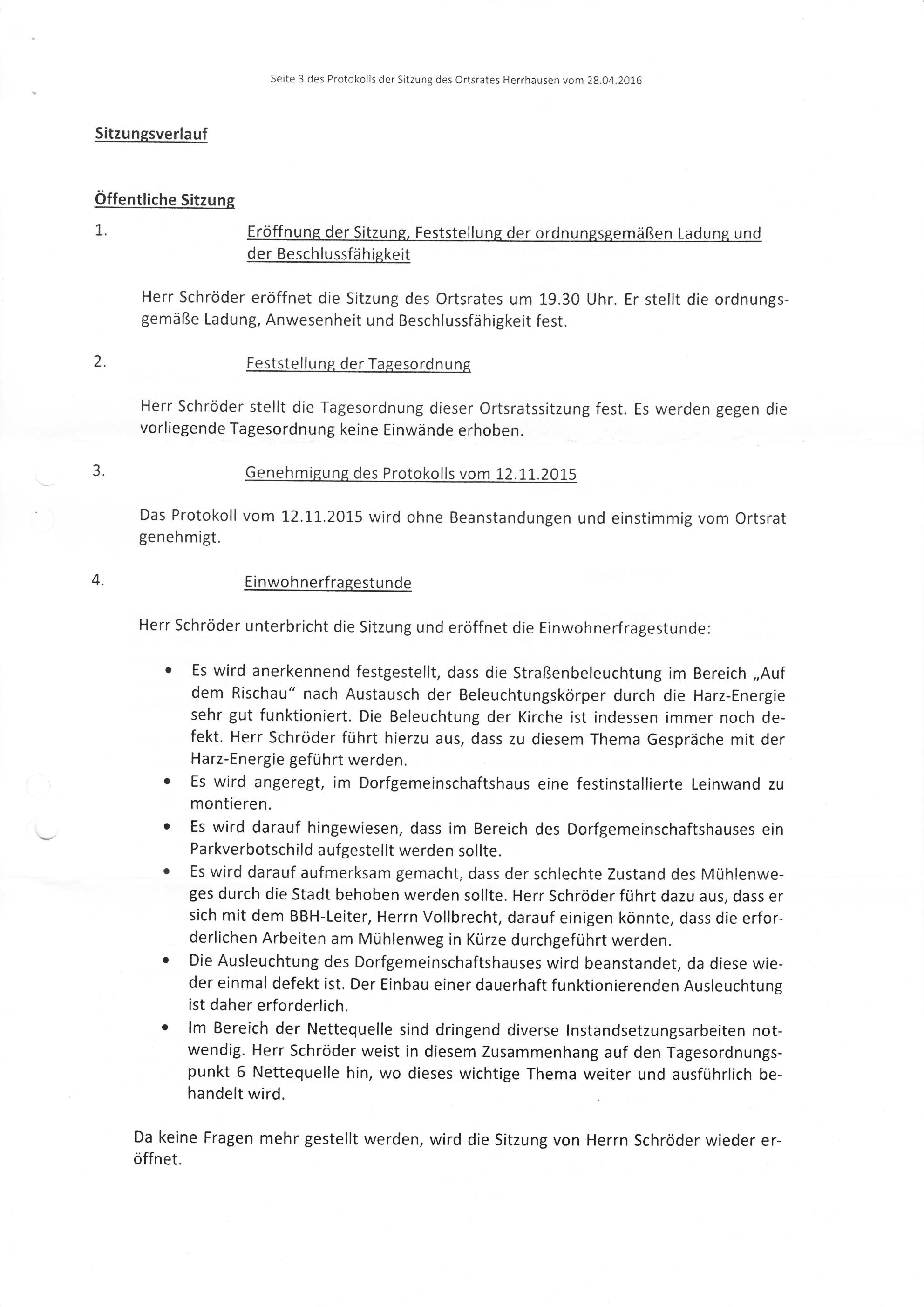 Protokoll über die Sitzung des Ortsrates Herrhausen am Donnerstag, dem 28.04.2016, 19:30 Uhr, in der Gaststätte "Zur Traube".