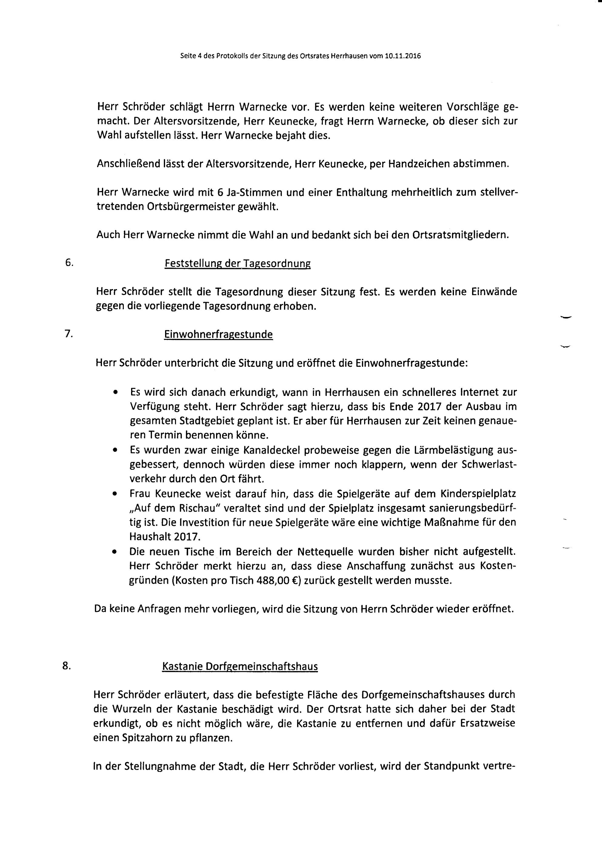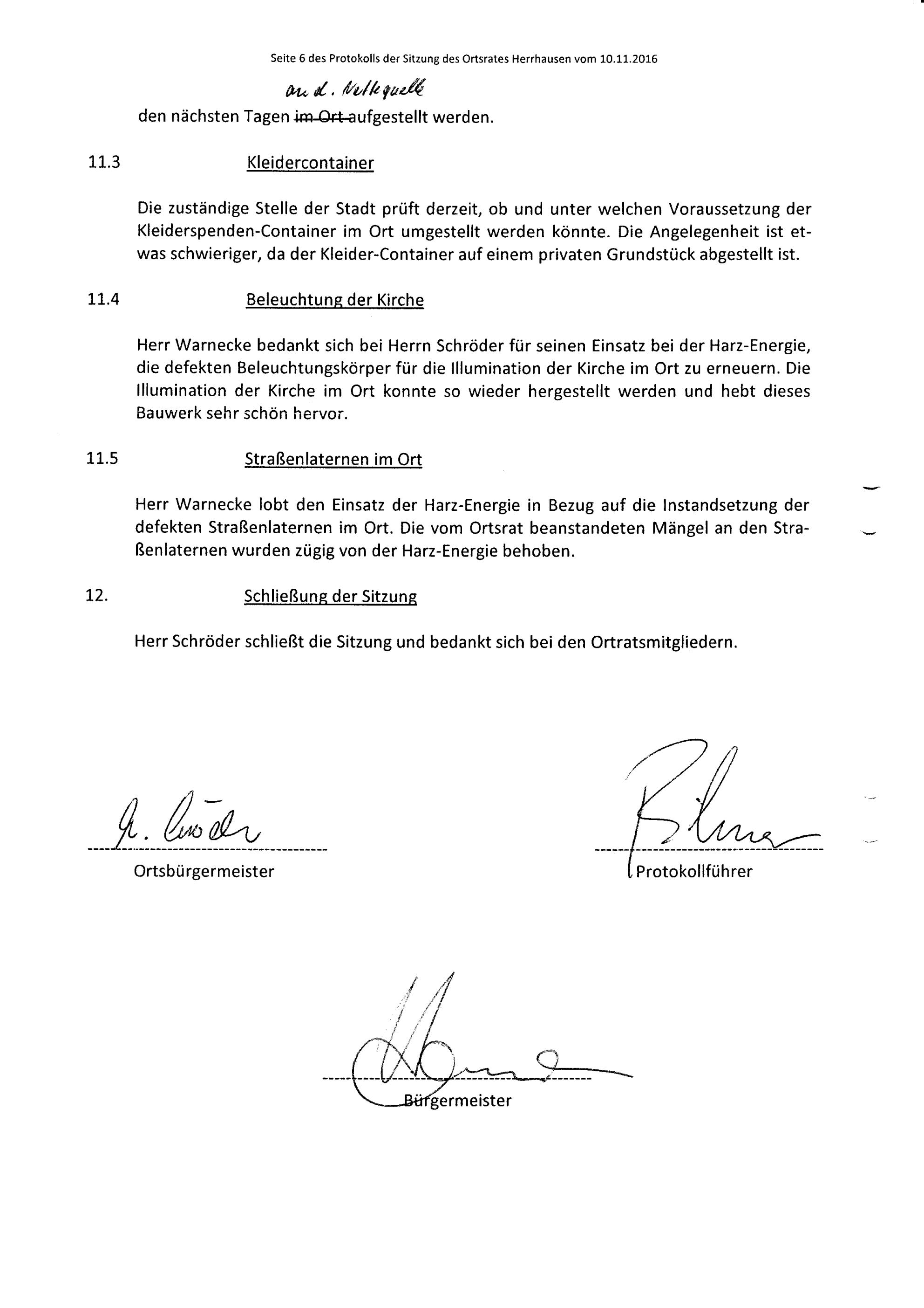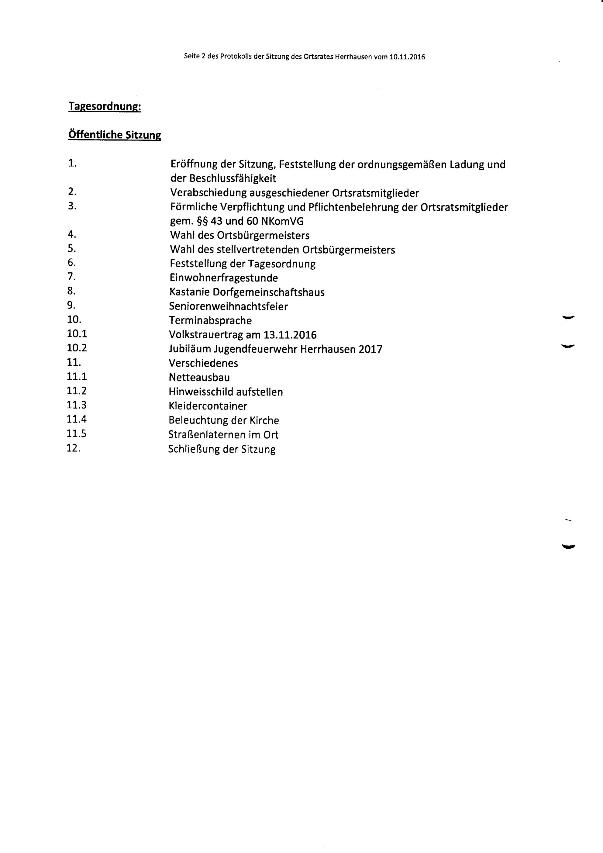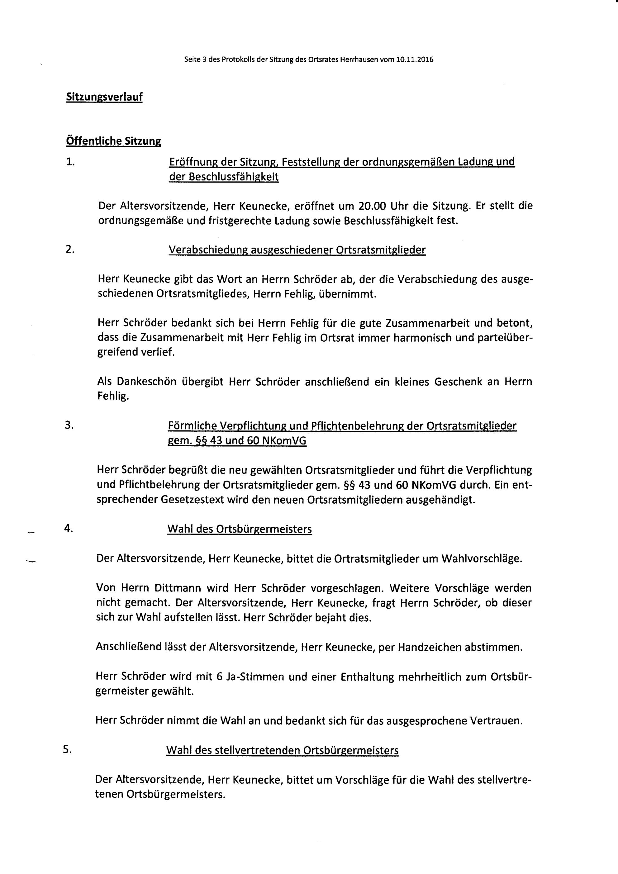 Protokoll über die Sitzung des Ortsrates Herrhausen am Donnerstag, dem 10.11.2016, 20:00 Uhr, in der Gaststätte "Zur Traube".