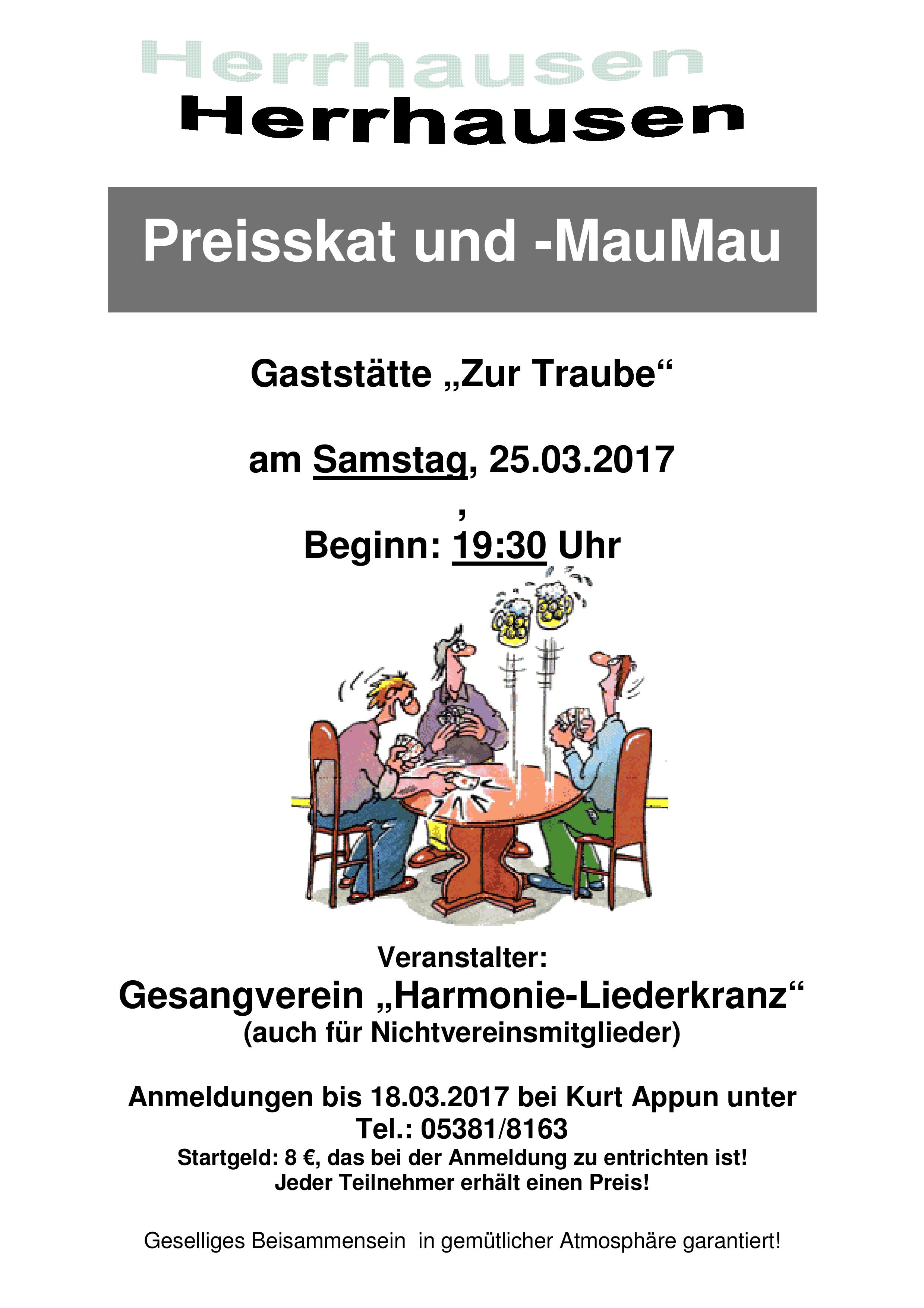 Auch in diesem Jahr veranstaltet der Gesangverein "Harmonie-Liederkranz" wieder ein Preisskat- und MauMau-Turnier.