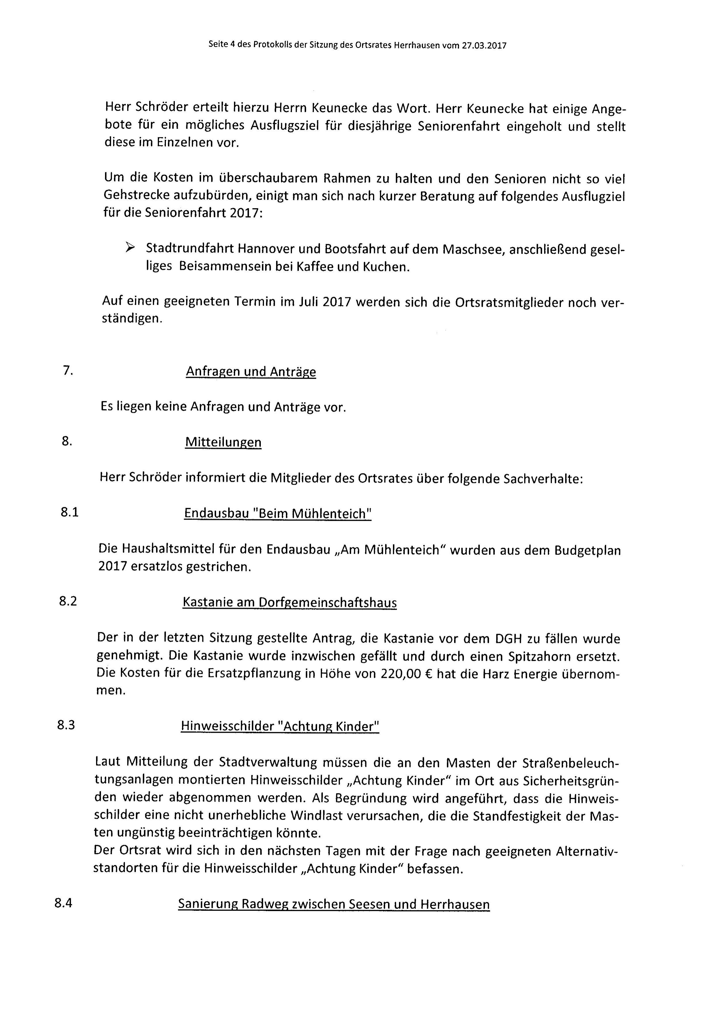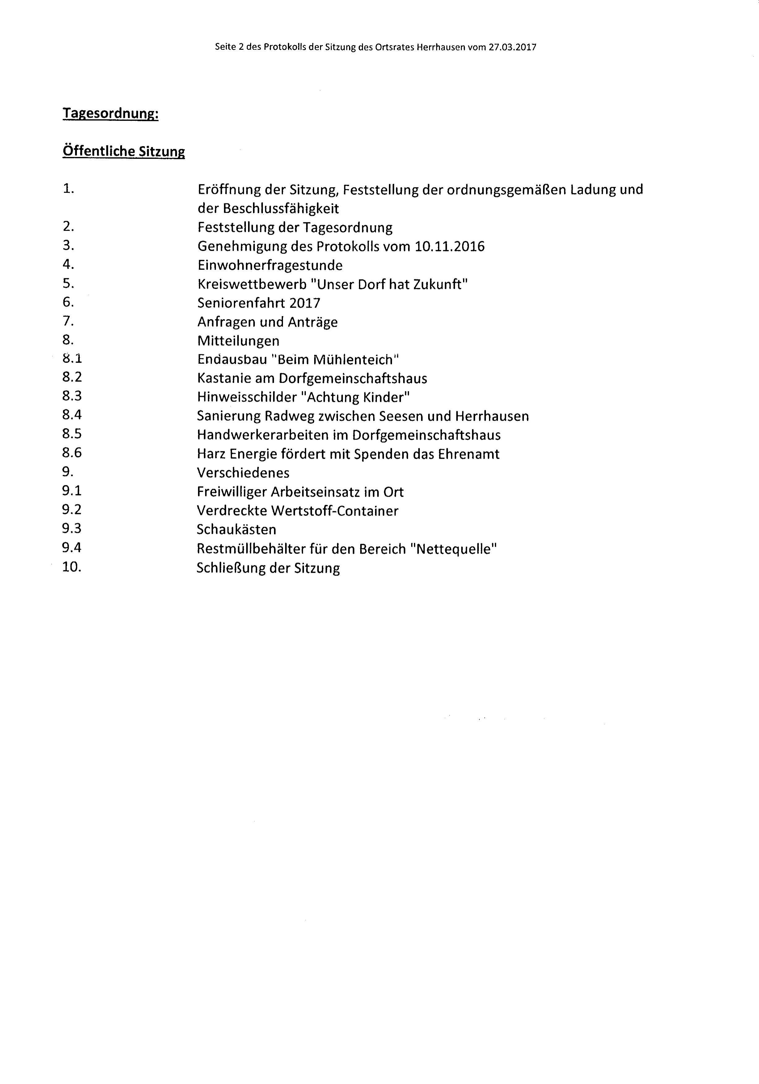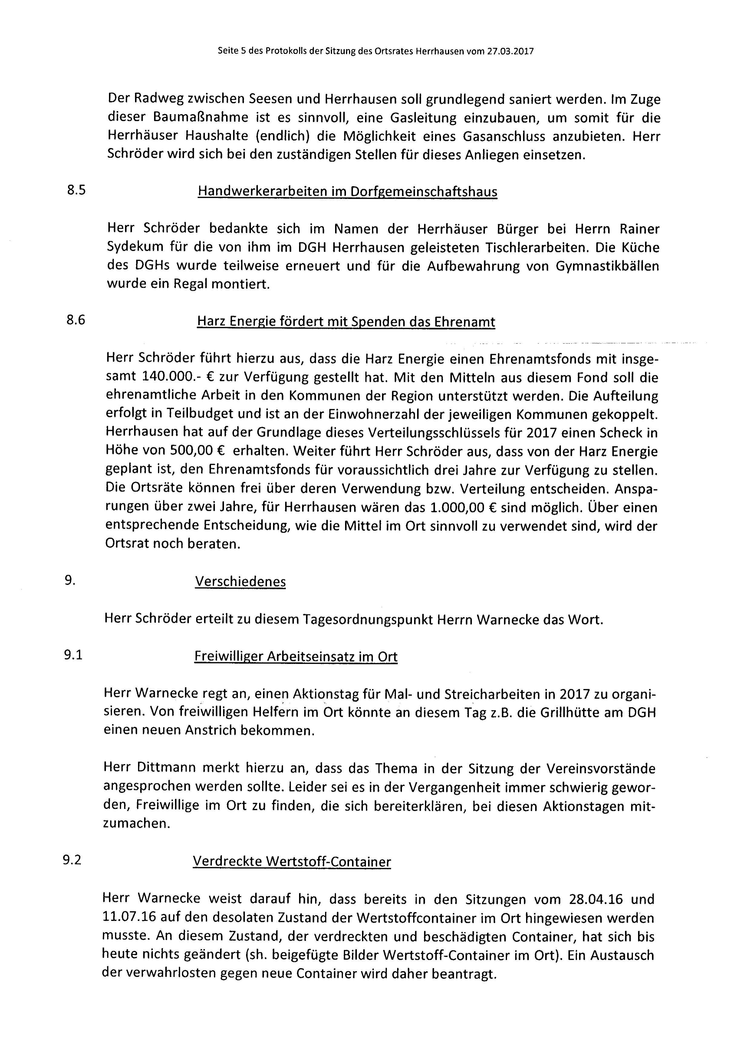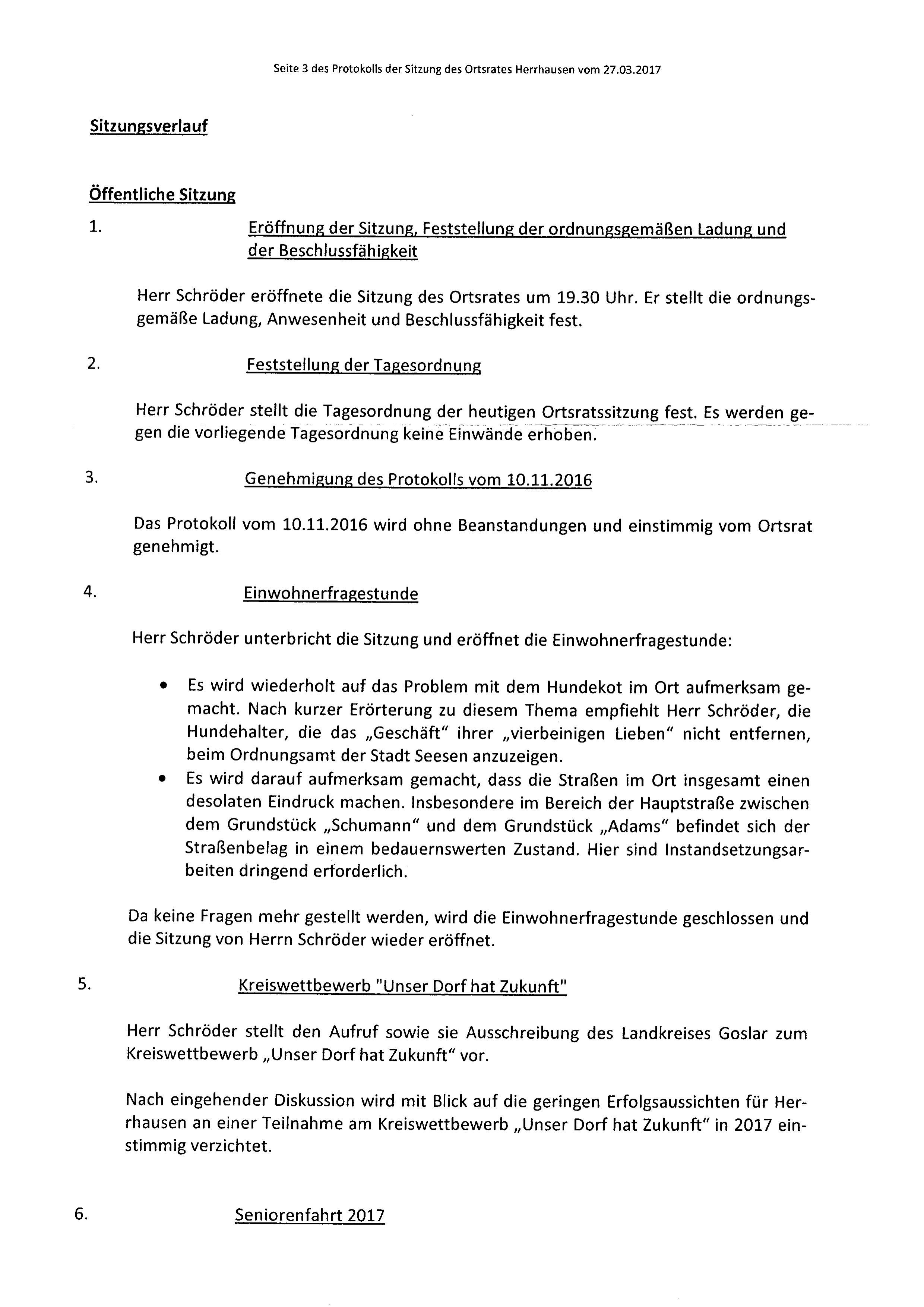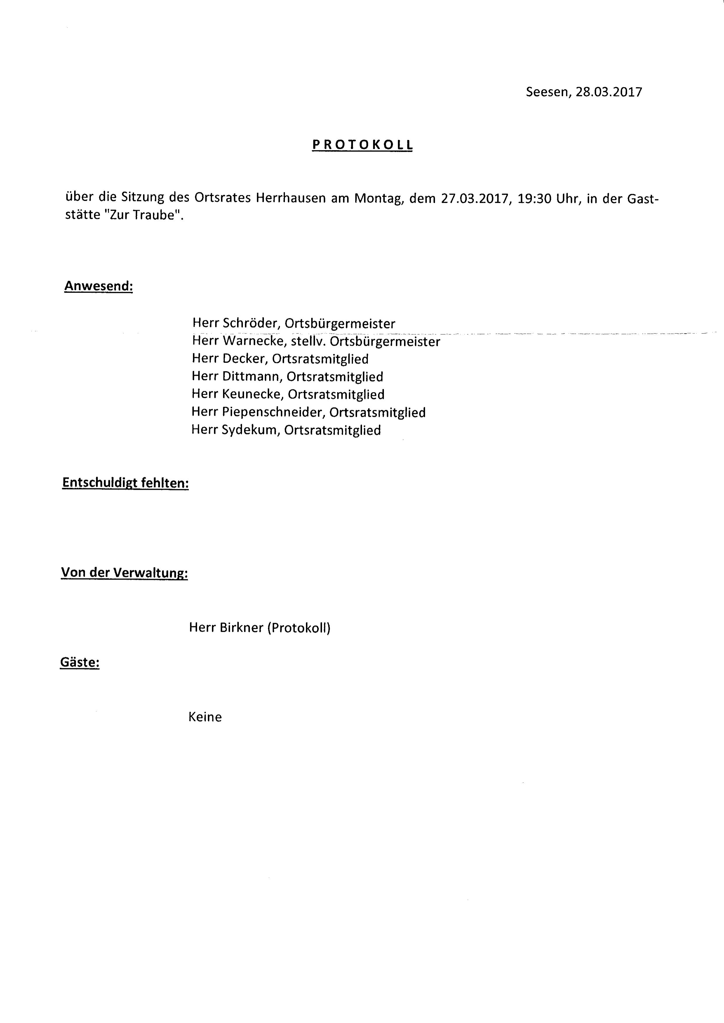 Protokoll über die Sitzung des Ortsrates Herrhausen am Donnerstag, dem 27.03.2017, 19:30 Uhr, in der Gaststätte "Zur Traube".
