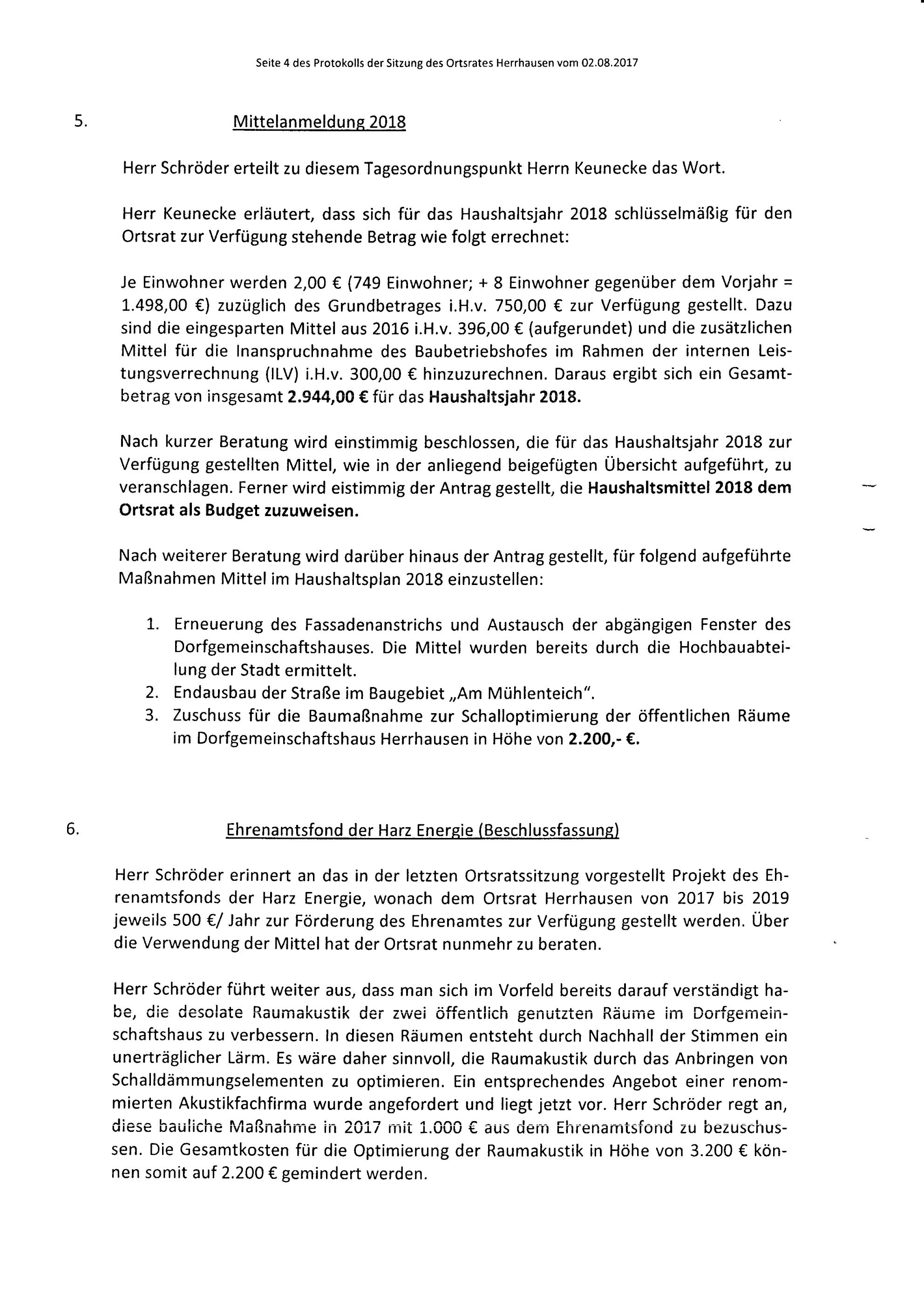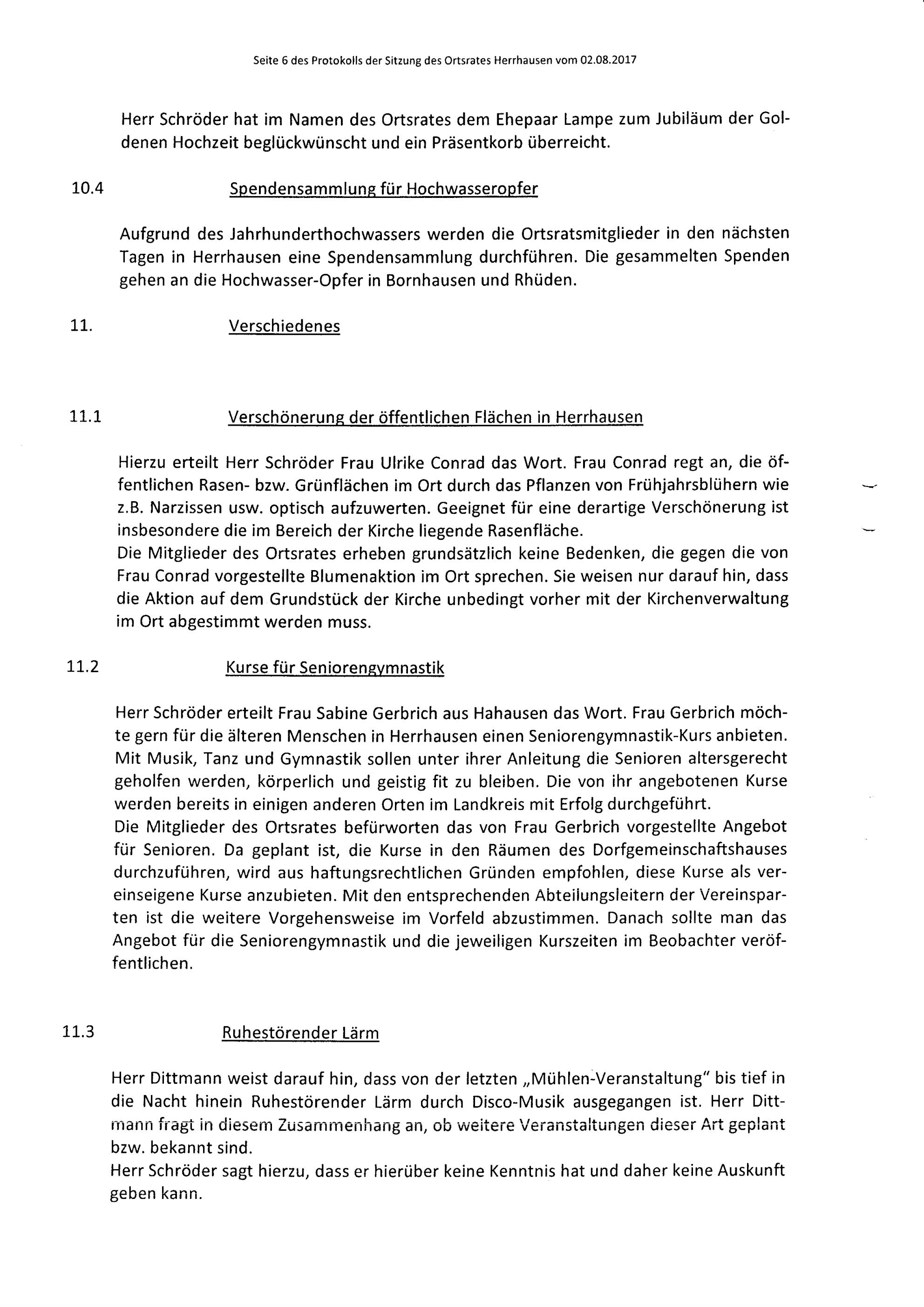 Protokoll über die Sitzung des Ortsrates Herrhausen am Mittwoch, dem 02.08.2017, 19:30 Uhr, in der Gaststätte "Zur Traube".