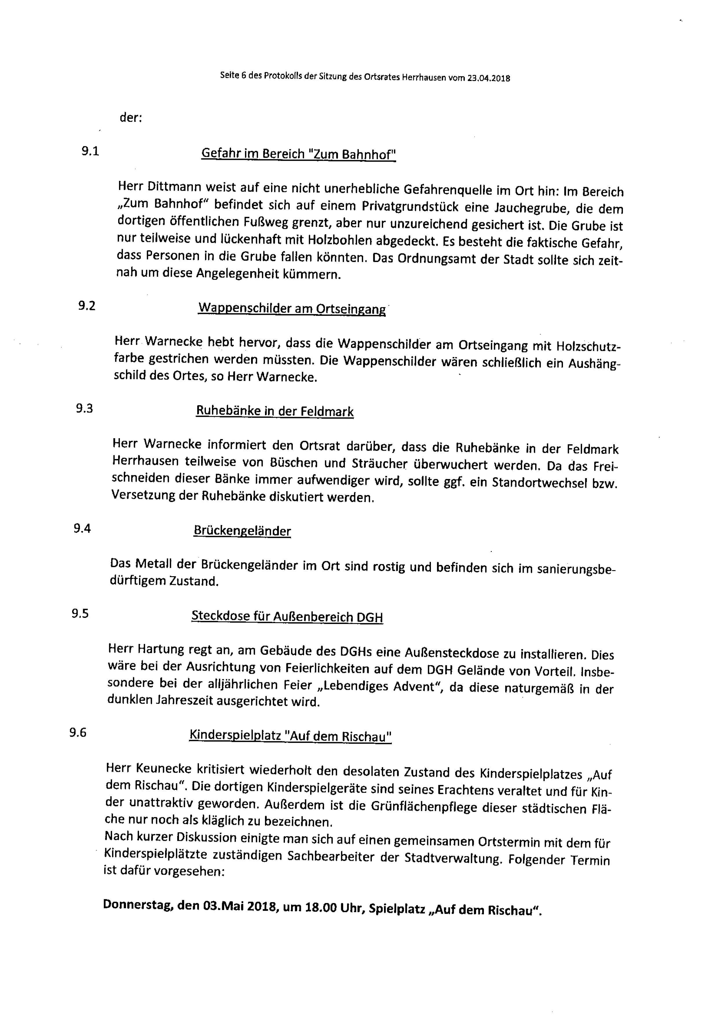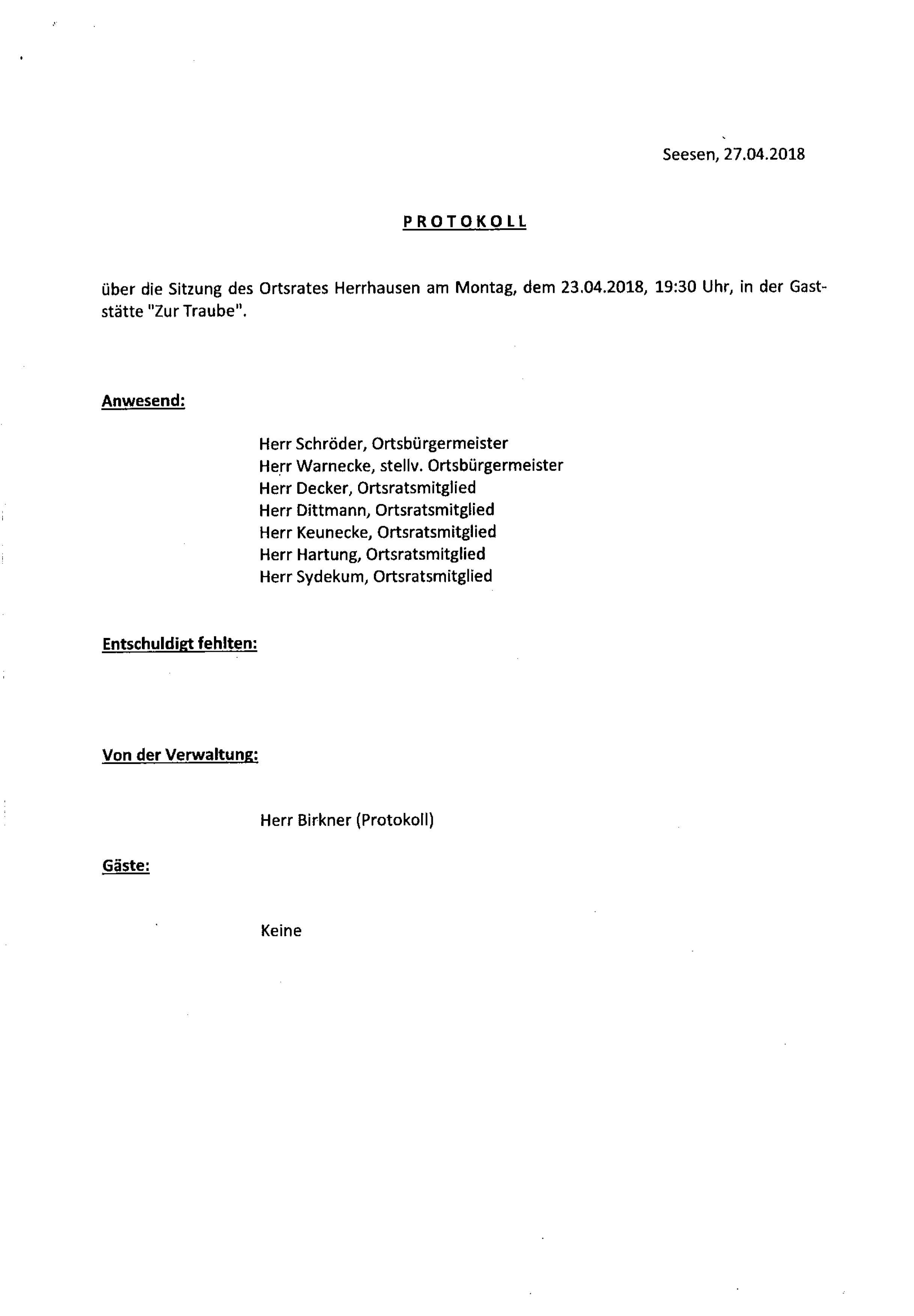 Protokoll über die Sitzung des Ortsrates Herrhausen am Donnerstag, dem 23.04.2018, 19:30 Uhr, in der Gaststätte "Zur Traube".