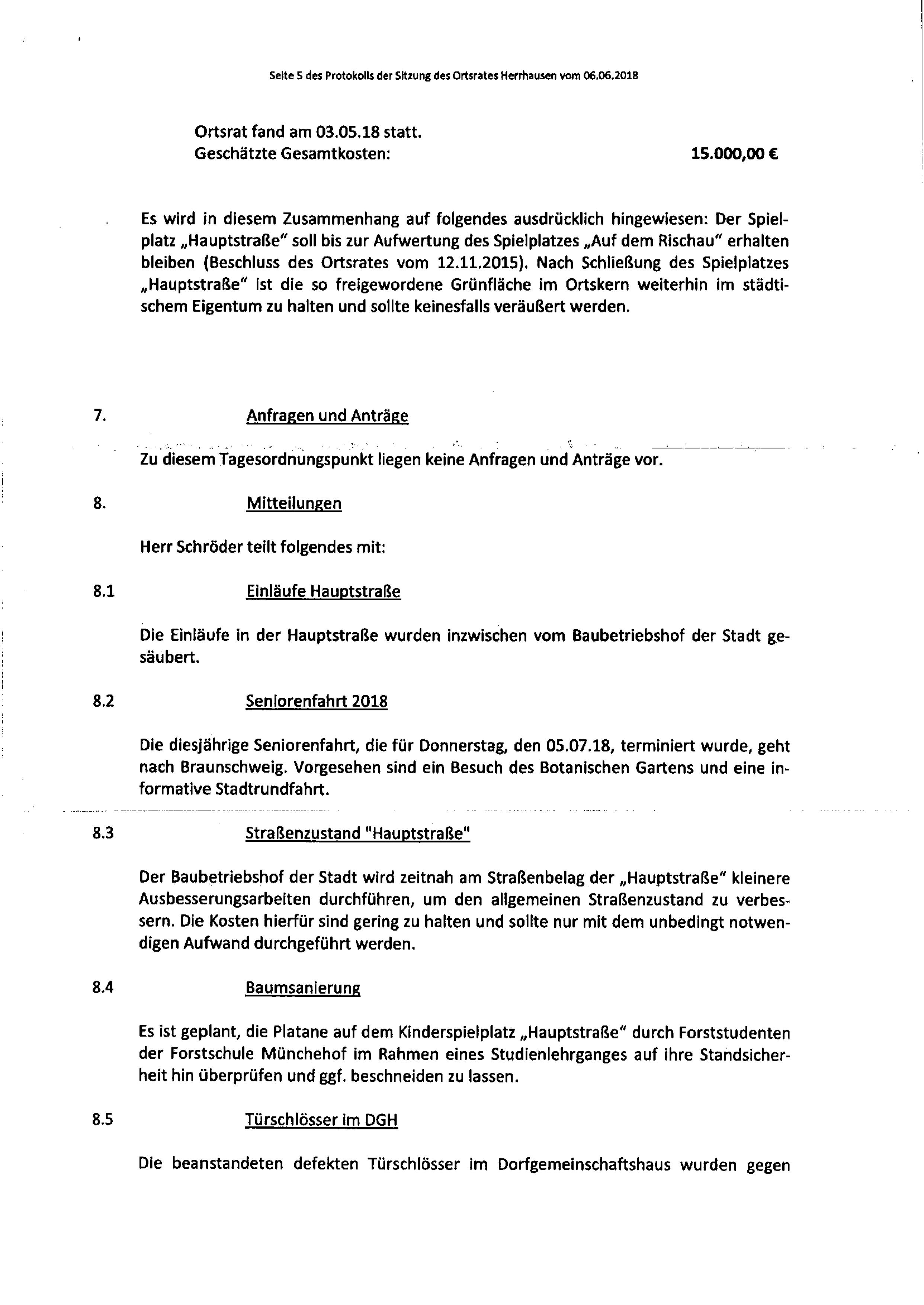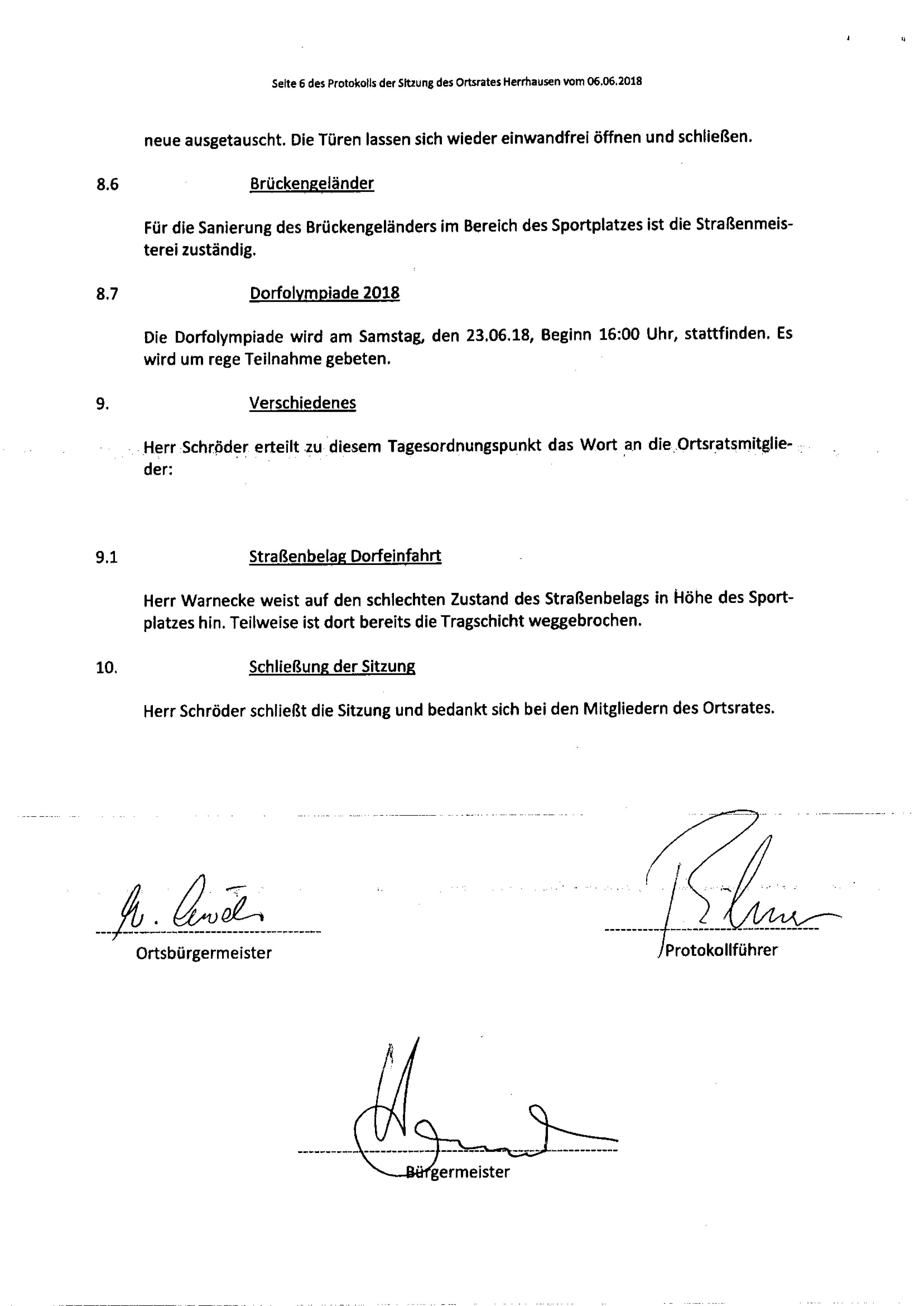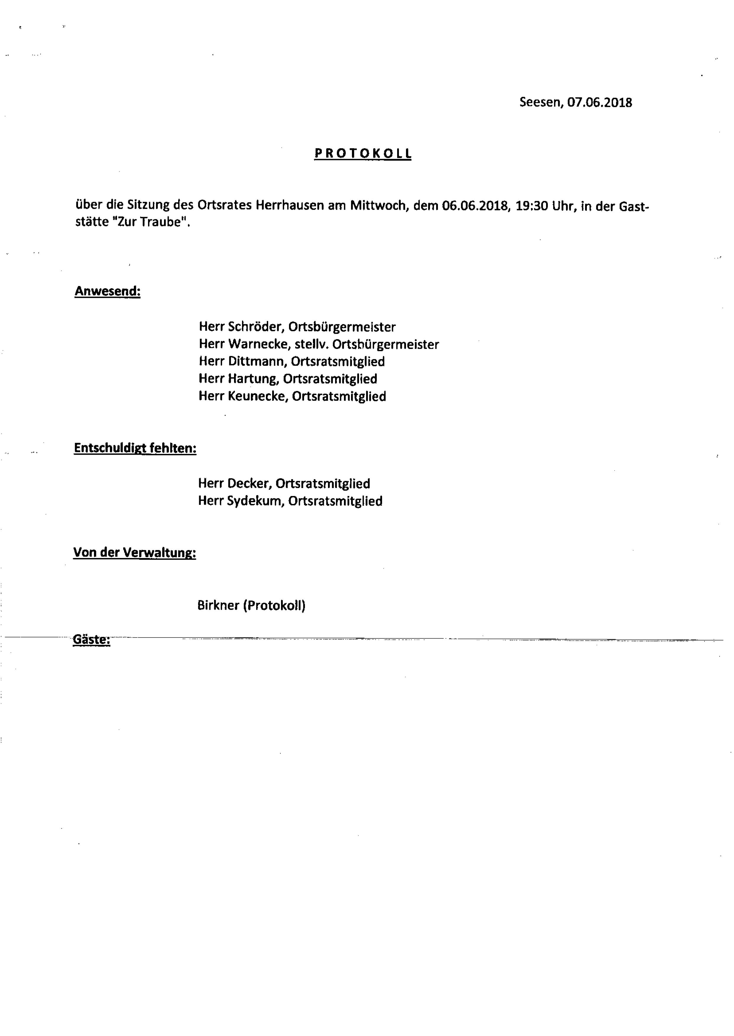Protokoll über die Sitzung des Ortsrates Herrhausen am Donnerstag, dem 06.06.2018, 19:30 Uhr, in der Gaststätte "Zur Traube".