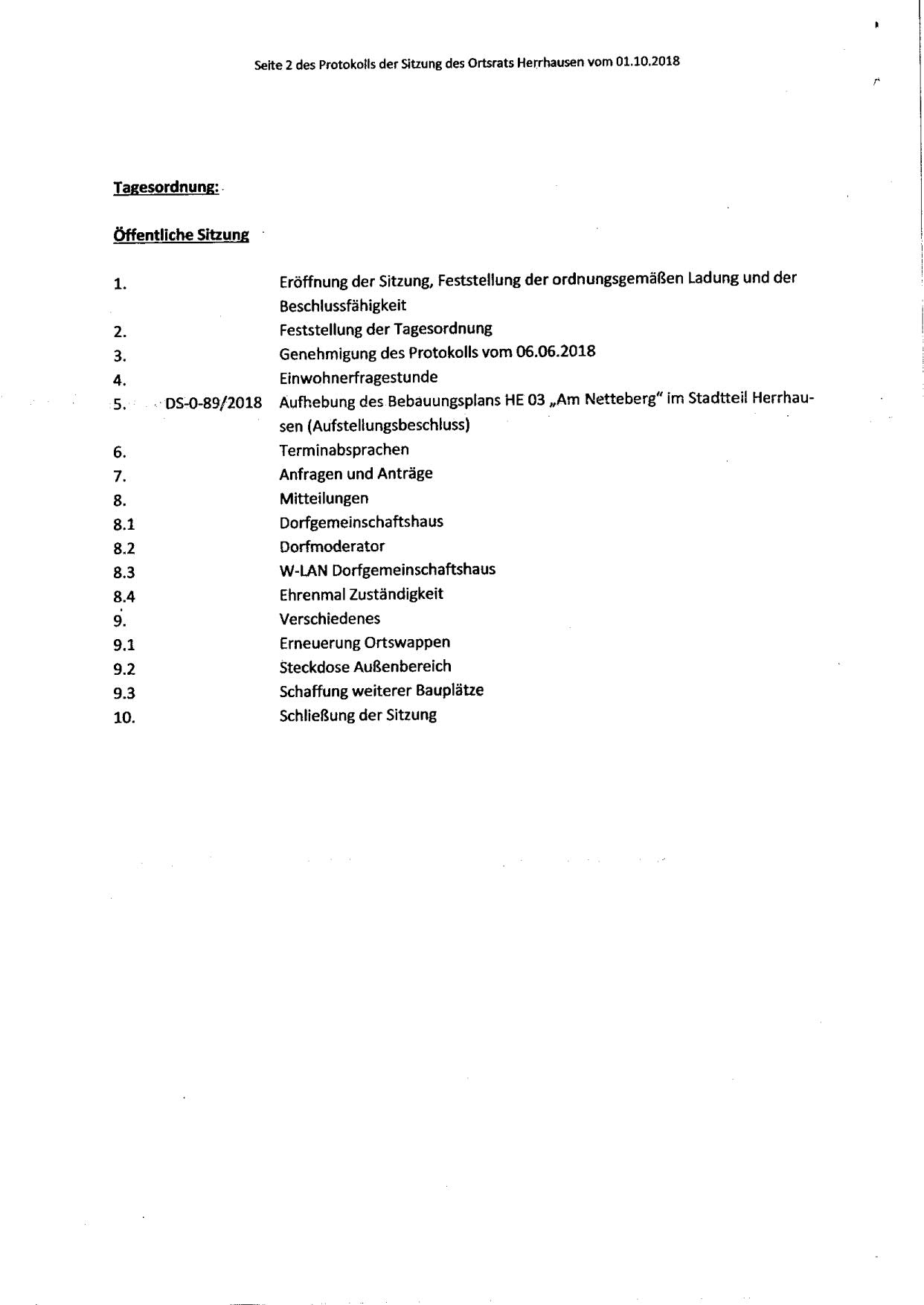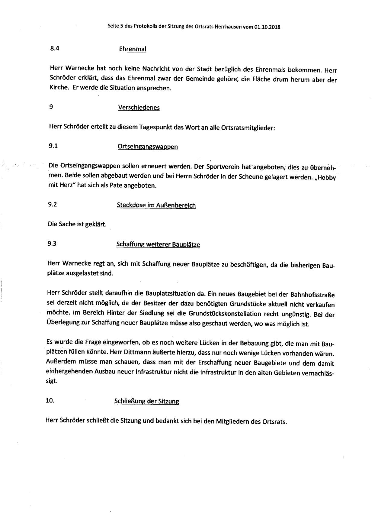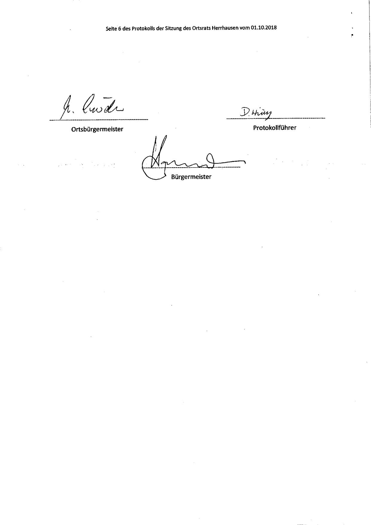 Protokoll über die Sitzung des Ortsrates Herrhausen am Montag, dem 01.10.2018, 19:30 Uhr, in der Gaststätte "Zur Traube".