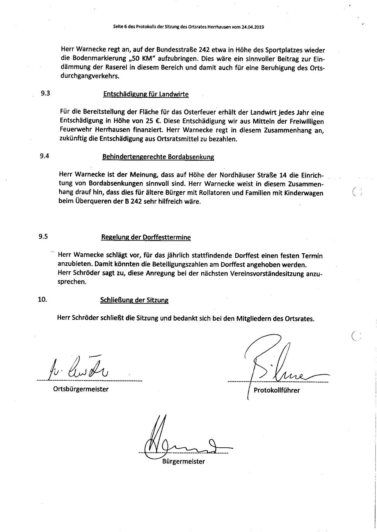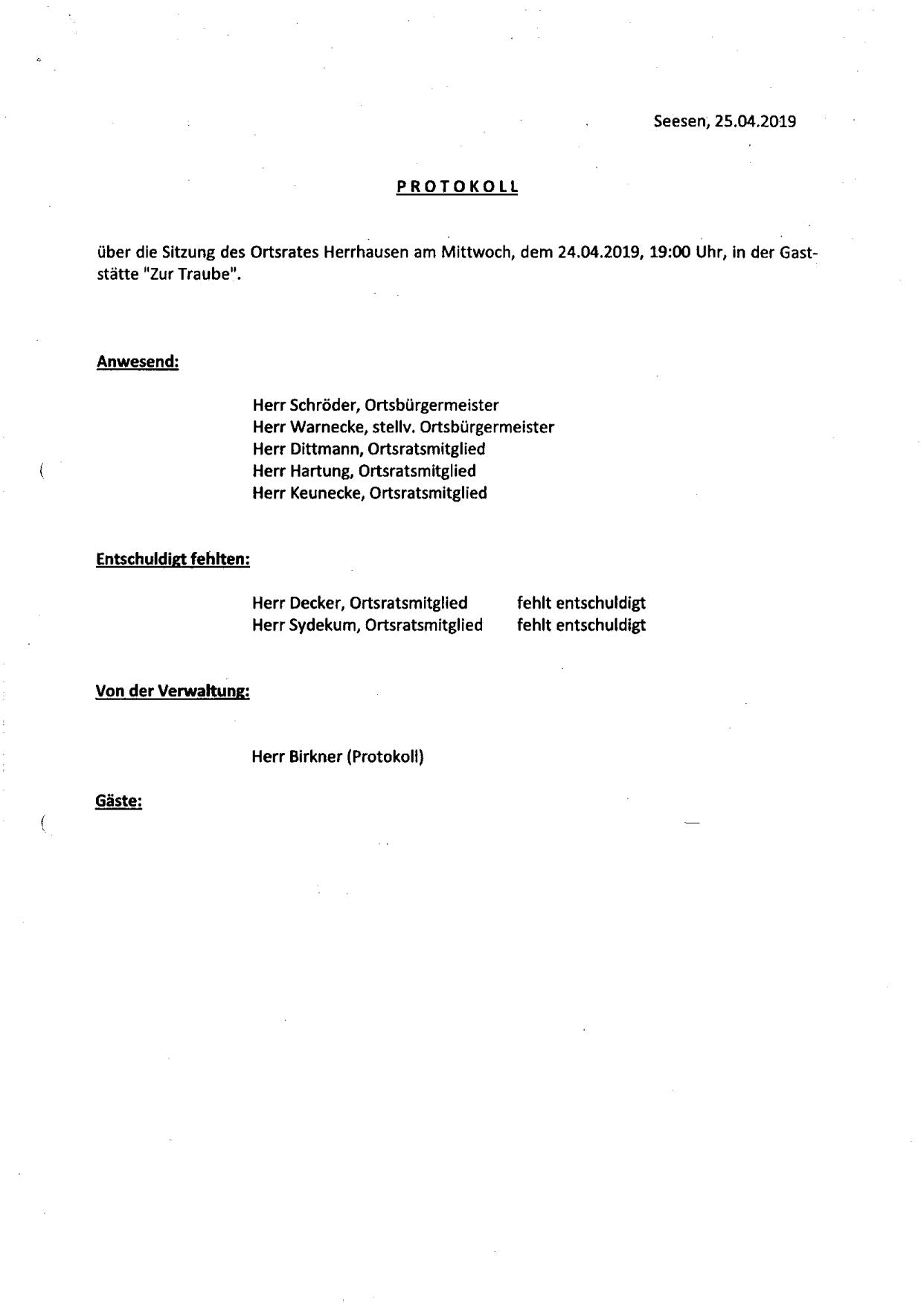Protokoll über die Sitzung des Ortsrates Herrhausen am Dienstag, dem 25.04.2019, 19:00 Uhr, in der Gaststätte "Zur Traube".