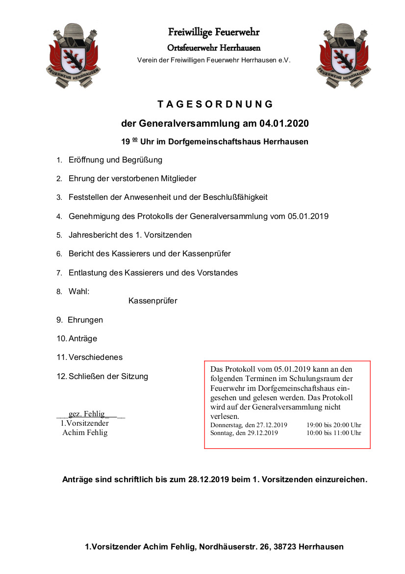 Um ein Verlesen der Protokolle auf den Versammlungen zu vermeiden, liegen die Protokolle am 27.12.2019 von 19:00 bis 20:00 Uhr und am 29.12.2019 von 10:00 bis 11:00 Uhr öffentlich im Schulungsraum der Feuerwehr im Dorfgemeinschaftshaus Herrhausen aus.