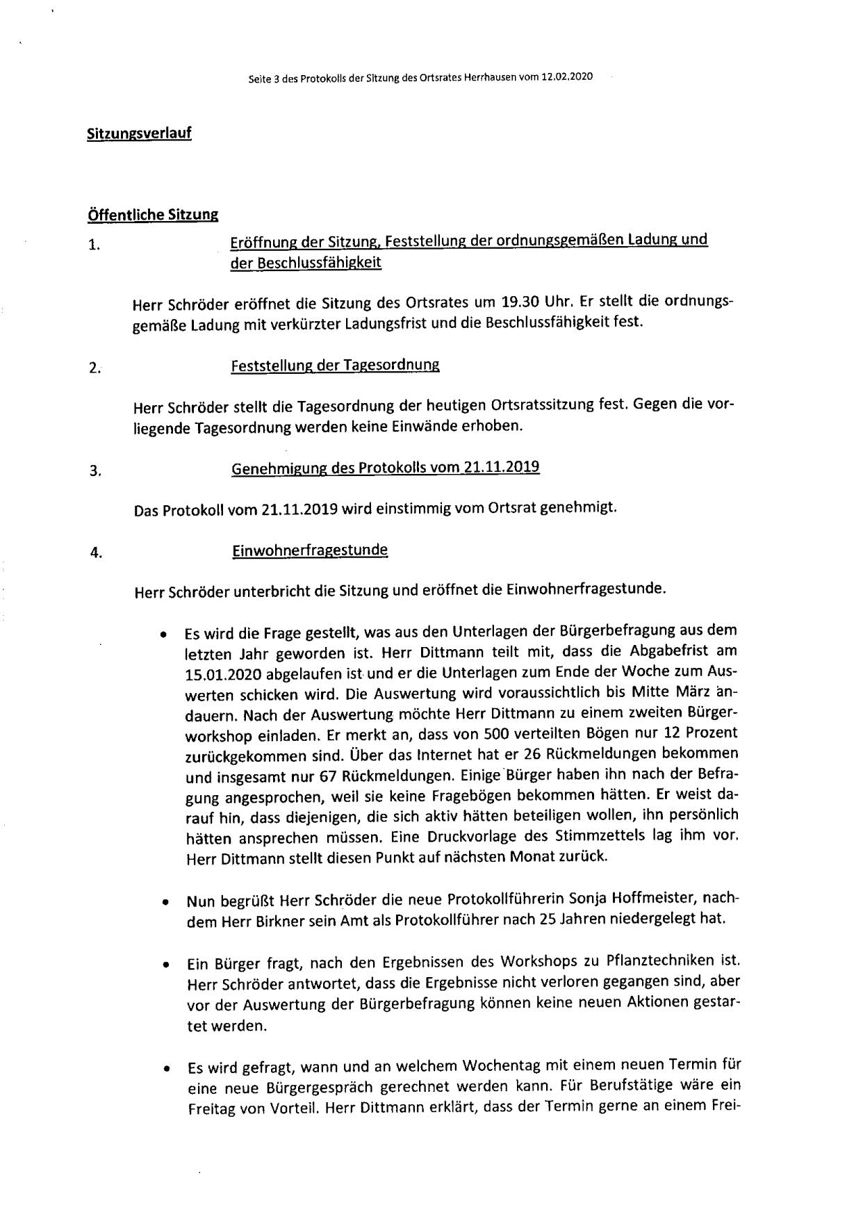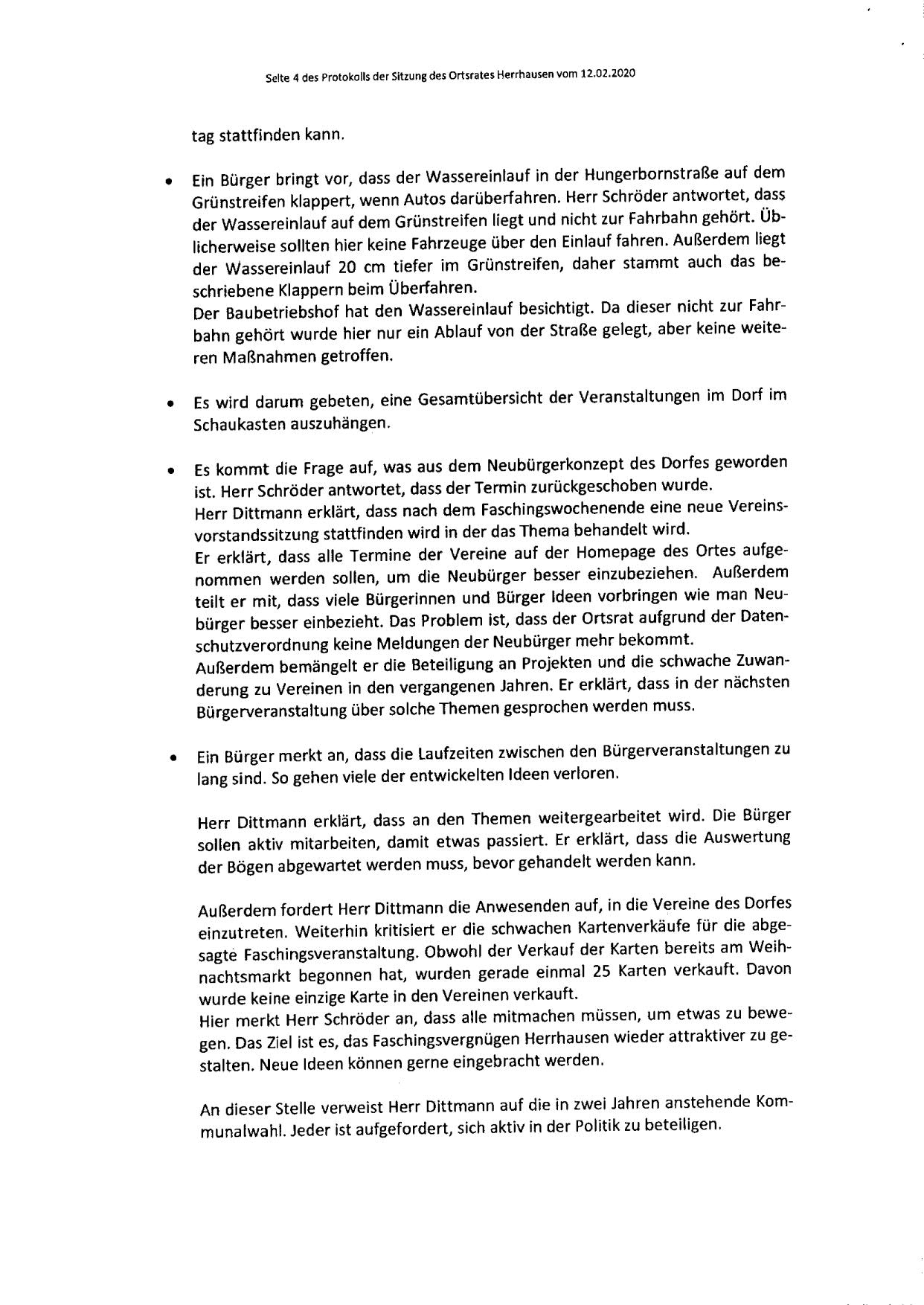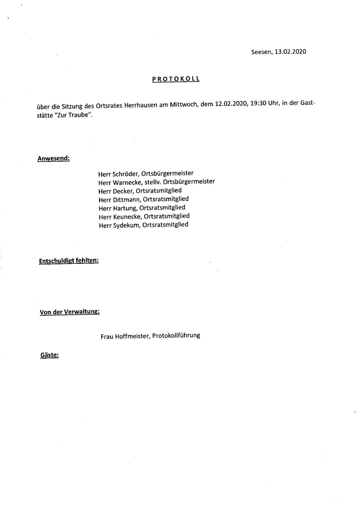 Protokoll über die Sitzung des Ortsrates Herrhausen am Dienstag, dem 12.02.2020, 19:30 Uhr, in der Gaststätte "Zur Traube".