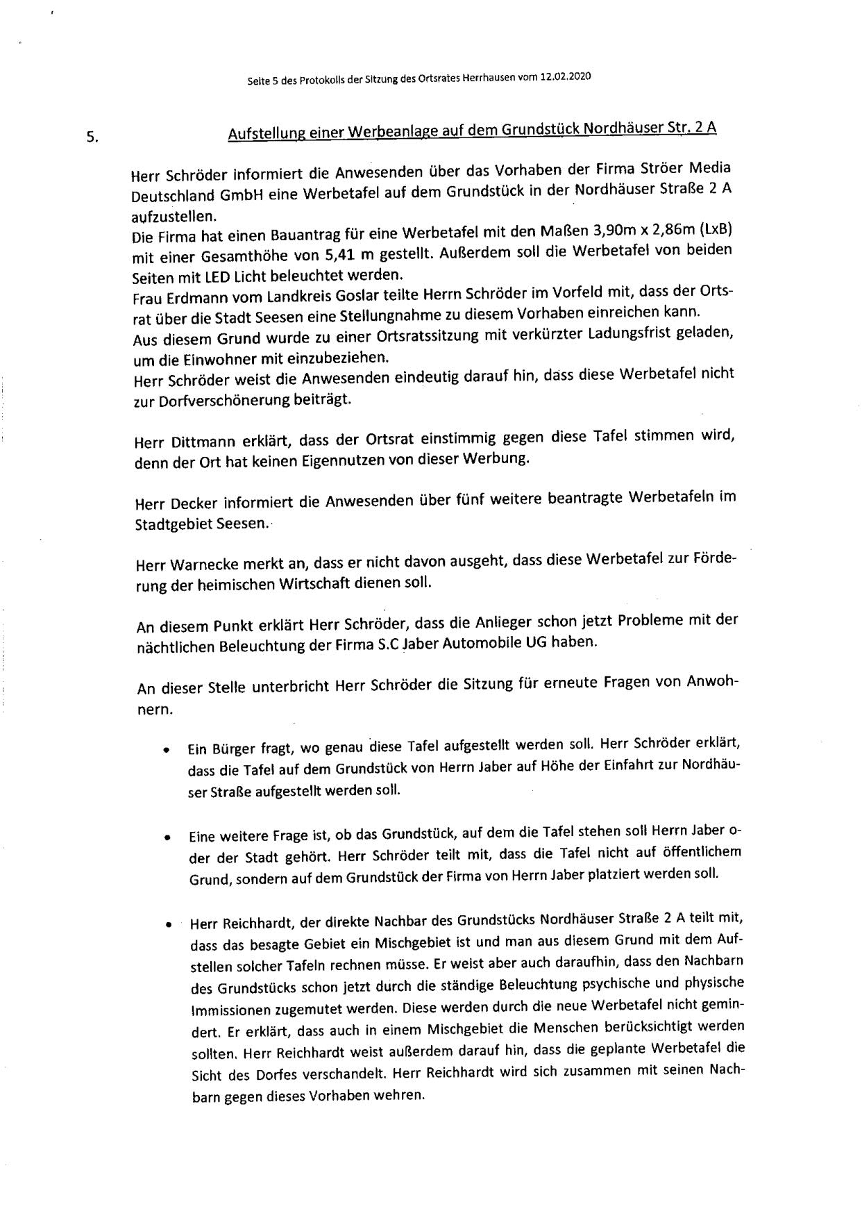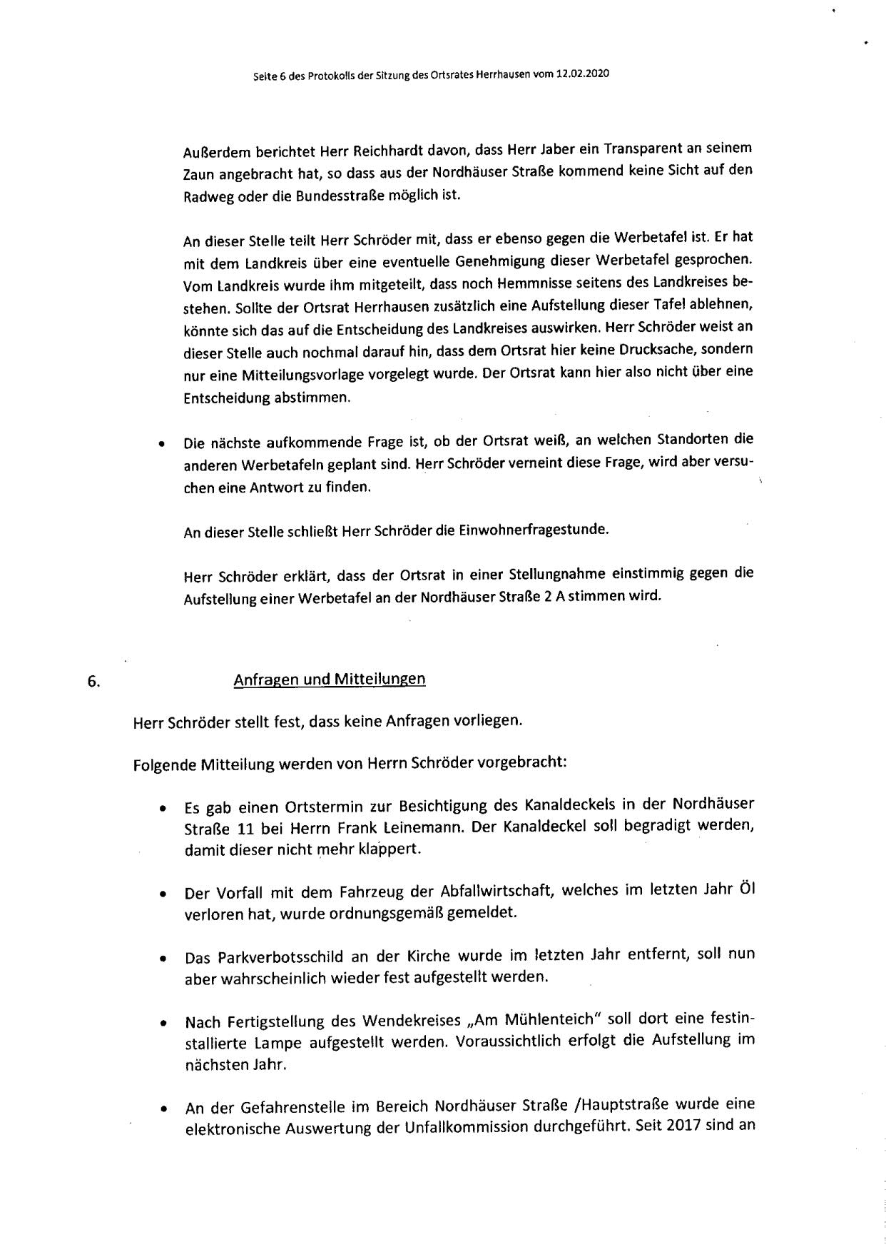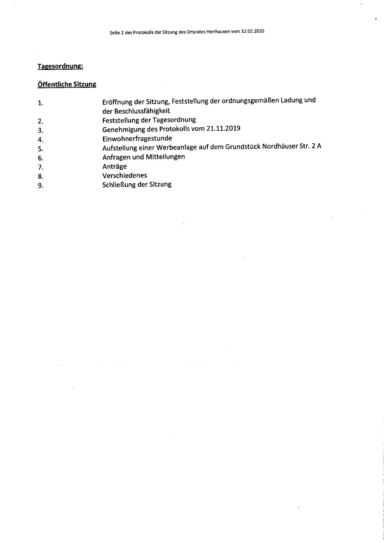 Protokoll über die Sitzung des Ortsrates Herrhausen am Dienstag, dem 12.02.2020, 19:30 Uhr, in der Gaststätte "Zur Traube".