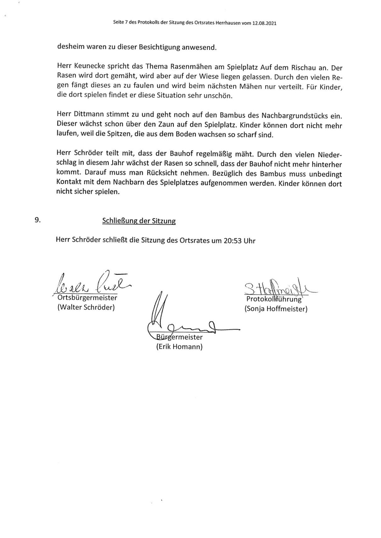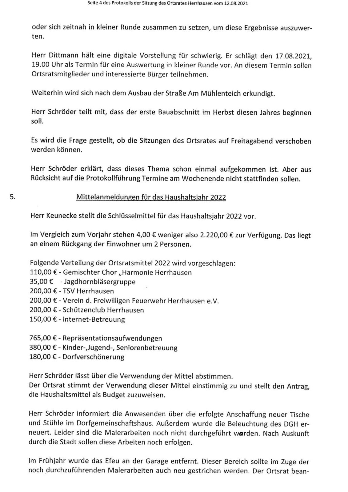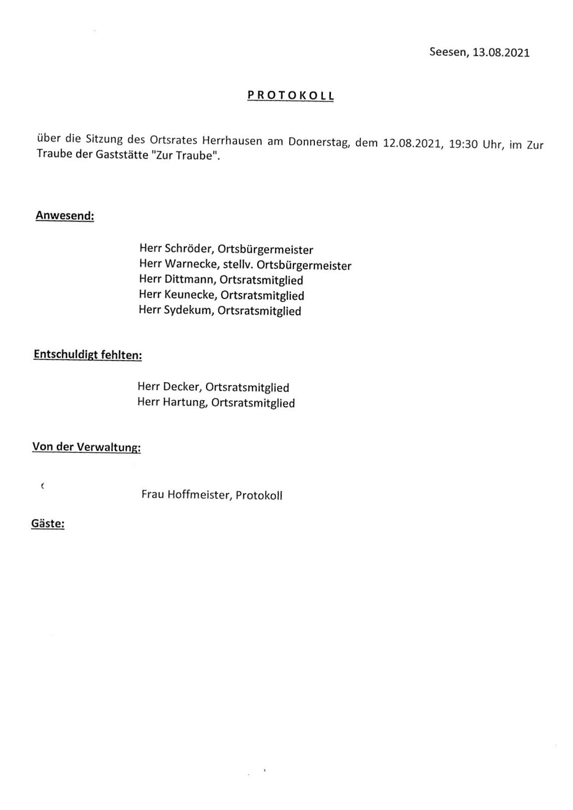 Protokoll über die Sitzung des Ortsrates Herrhausen am Donnerstag, dem 12.08.2021, 19:30 Uhr, in der Gaststätte "Zur Traube".