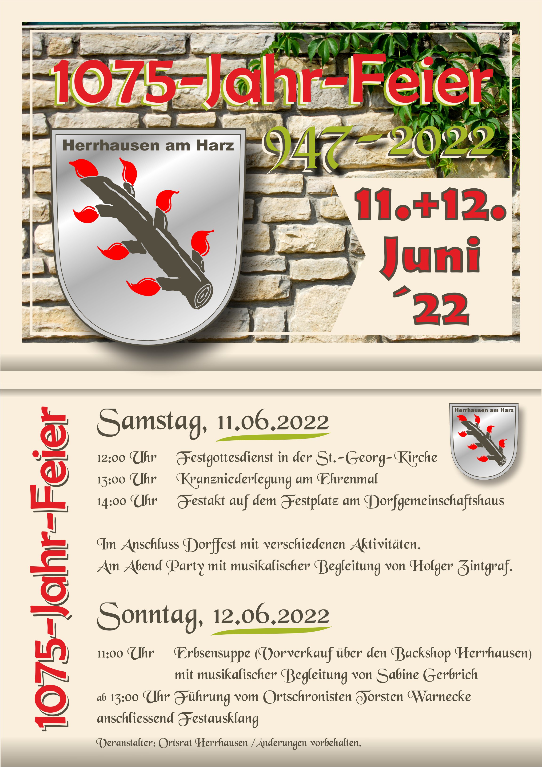 Der Ortsrat Herrhausen lädt am 11. und 12. Juni 2022 zu einer Feier anlässlich des 1075. Dorfjubiläums ein. Die Feierlichkeiten beginnen am Samstag, 11.06.2022 um 12:00 Uhr mit einem Gottesdienst in der St. Georg Kirche. Im Anschluss wird ein Kranz am Ehrenmal niedergelegt, bevor es um 14:00 Uhr zum Festakt am Dorfgemeinschaftshaus geht. Ab 15:00 Uhr kann man bei Kaffee und Kuchen nette Gespräche führen. Am Abend wird Holger Zintgraf die Feier mit Musik begleiten.