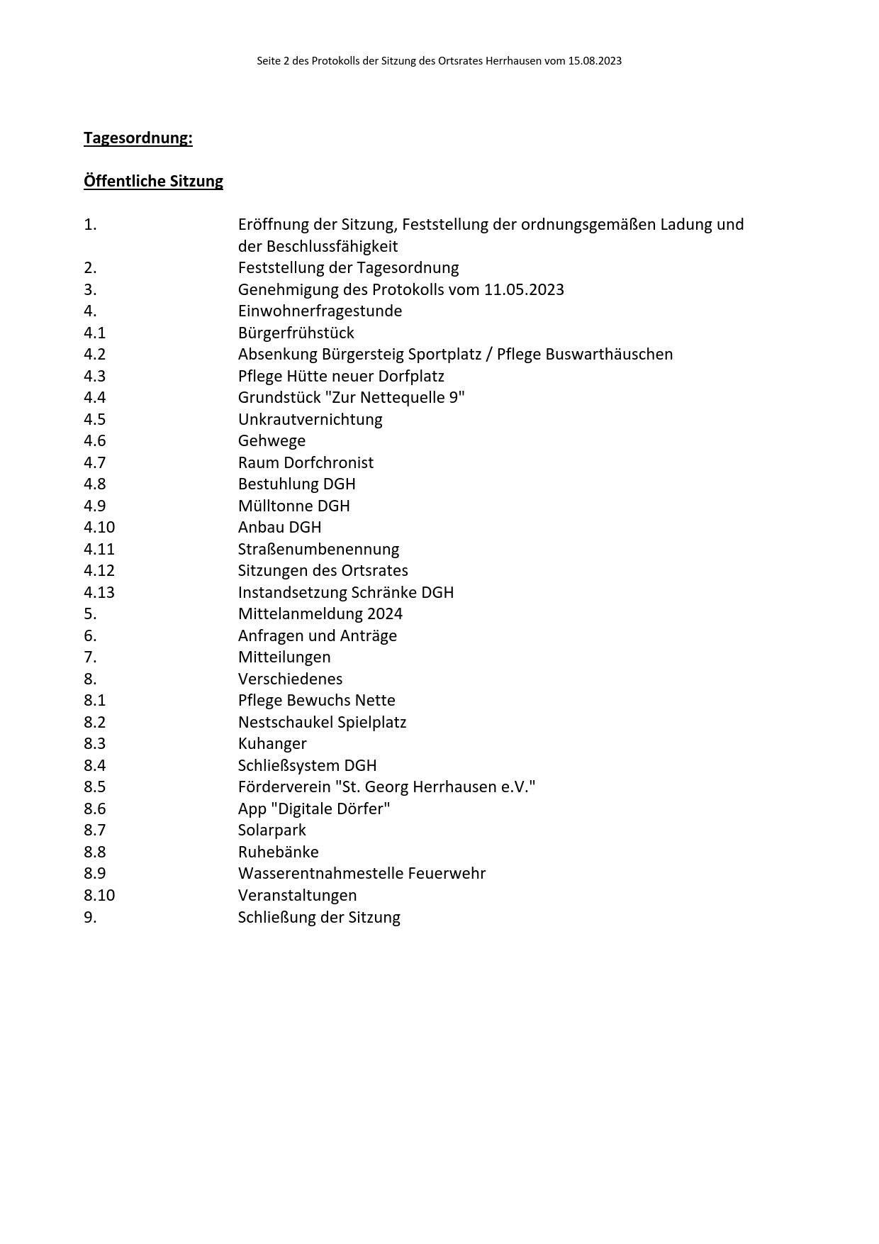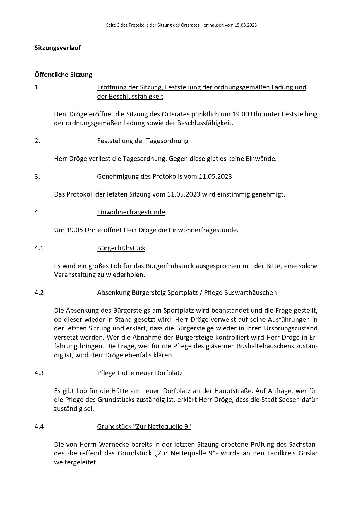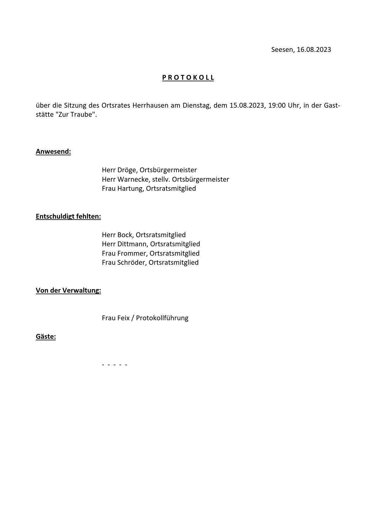 Protokoll über die Sitzung des Ortsrates Herrhausen am Dienstag, dem 15.08.2023, 19:00 Uhr, in der Gaststätte "Zur Traube".