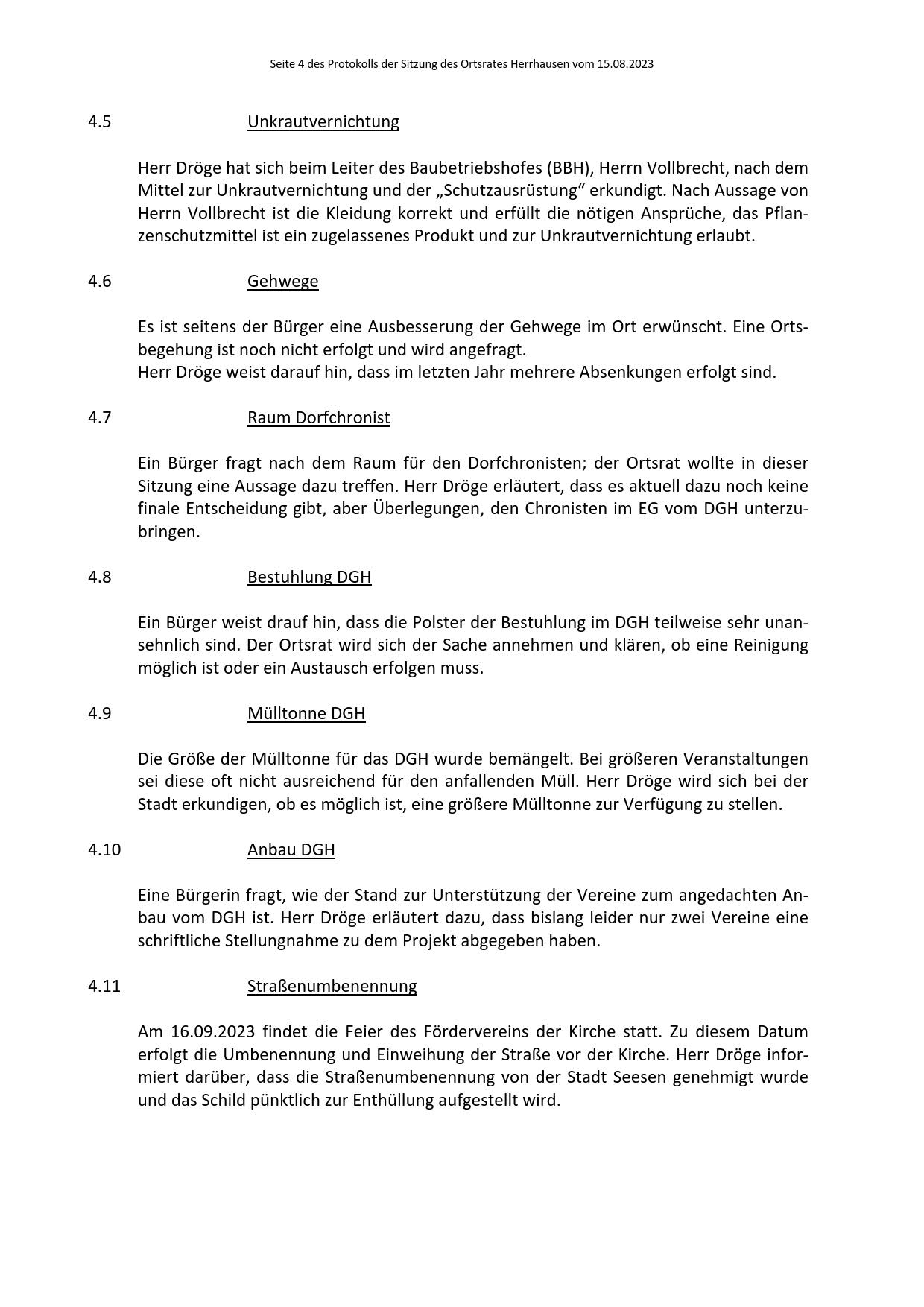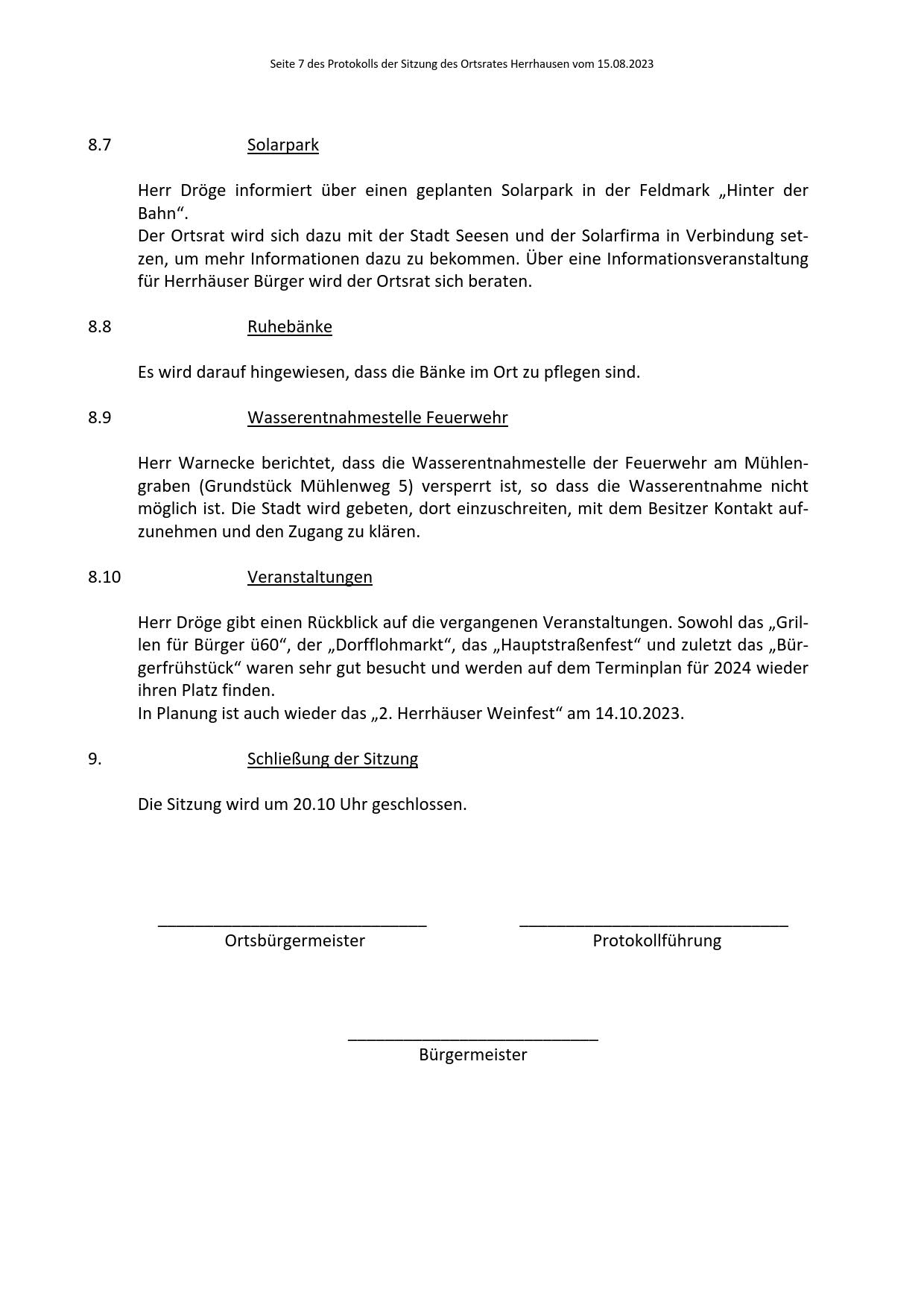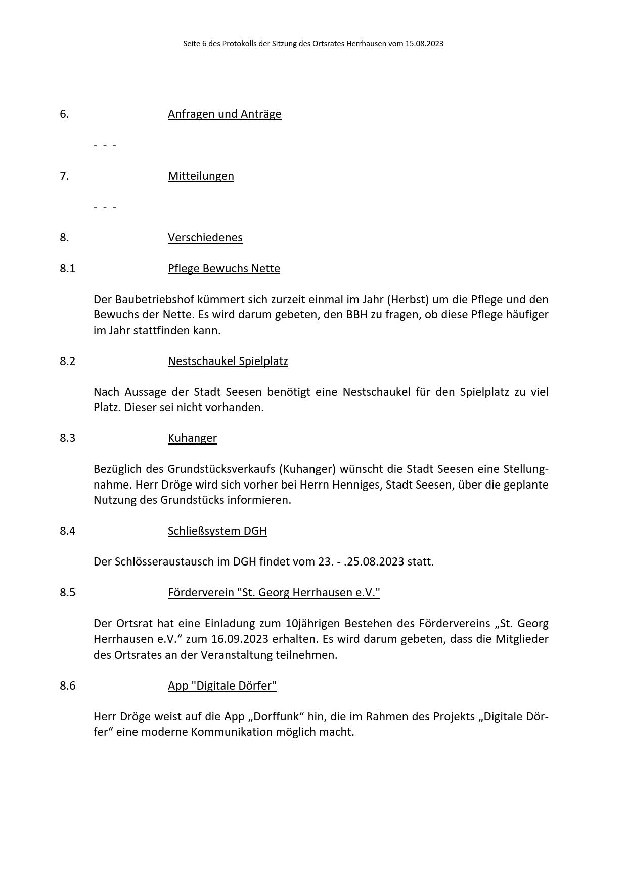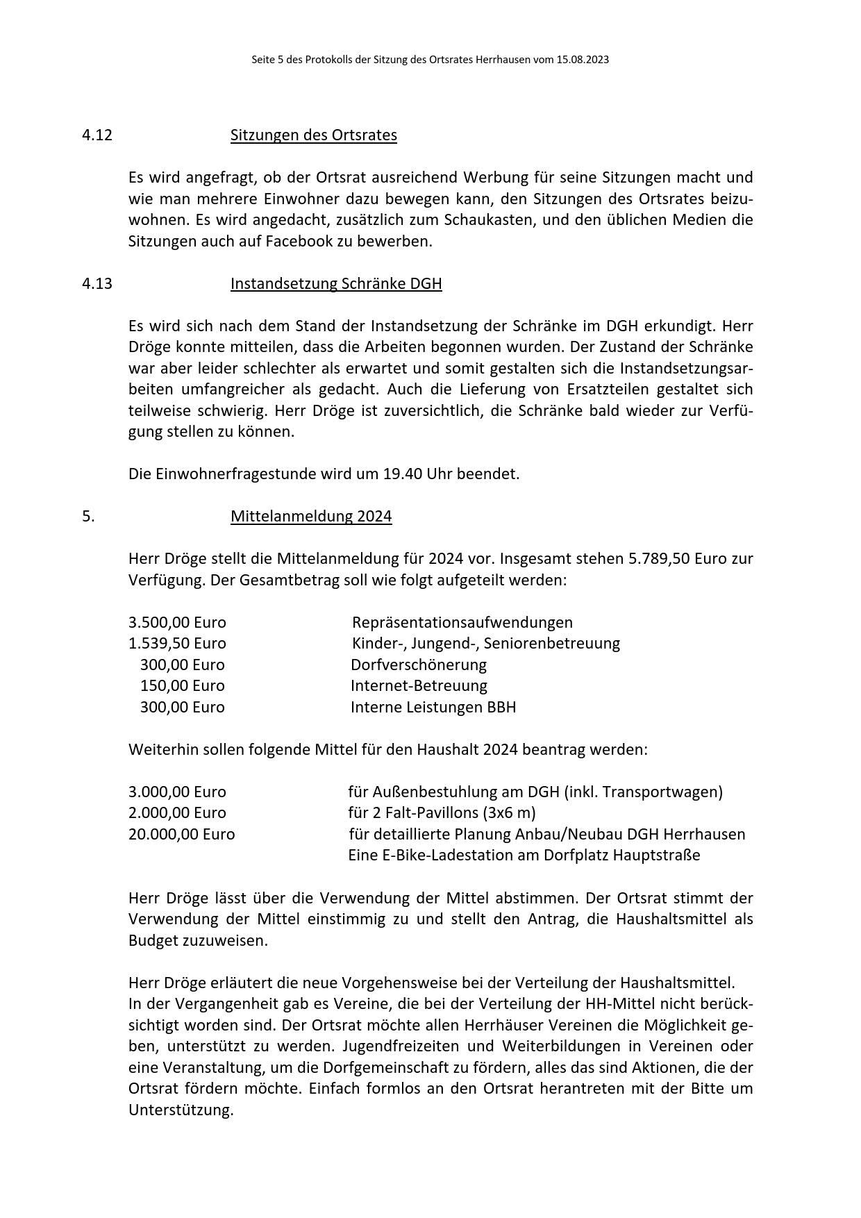 Protokoll über die Sitzung des Ortsrates Herrhausen am Dienstag, dem 15.08.2023, 19:00 Uhr, in der Gaststätte "Zur Traube".