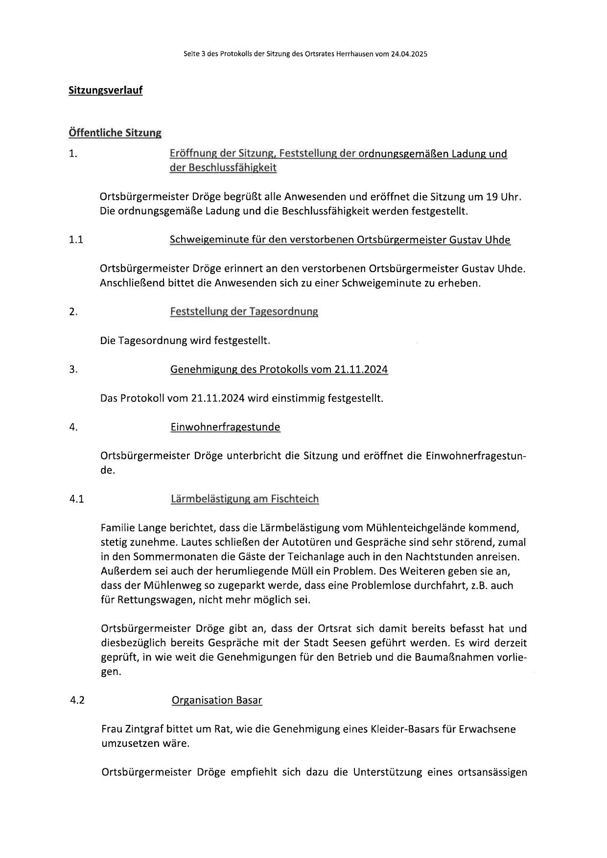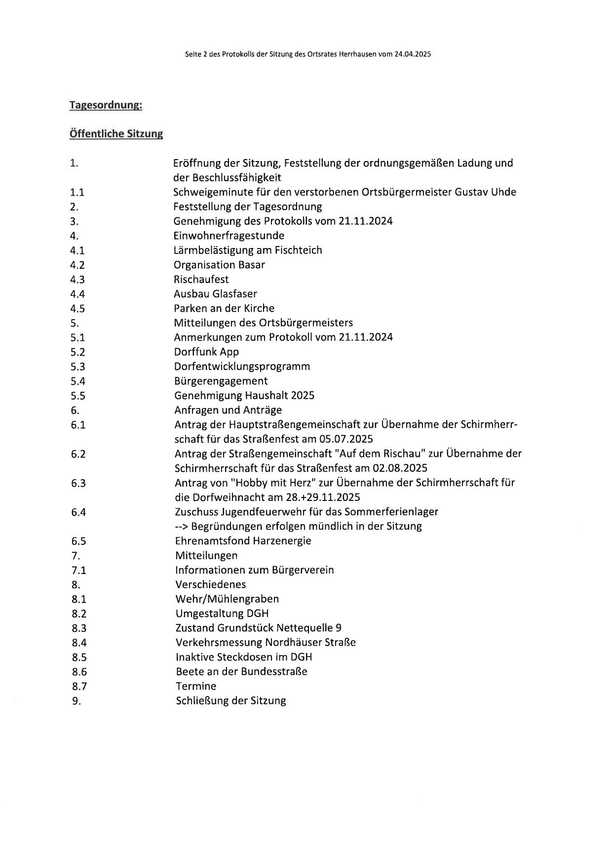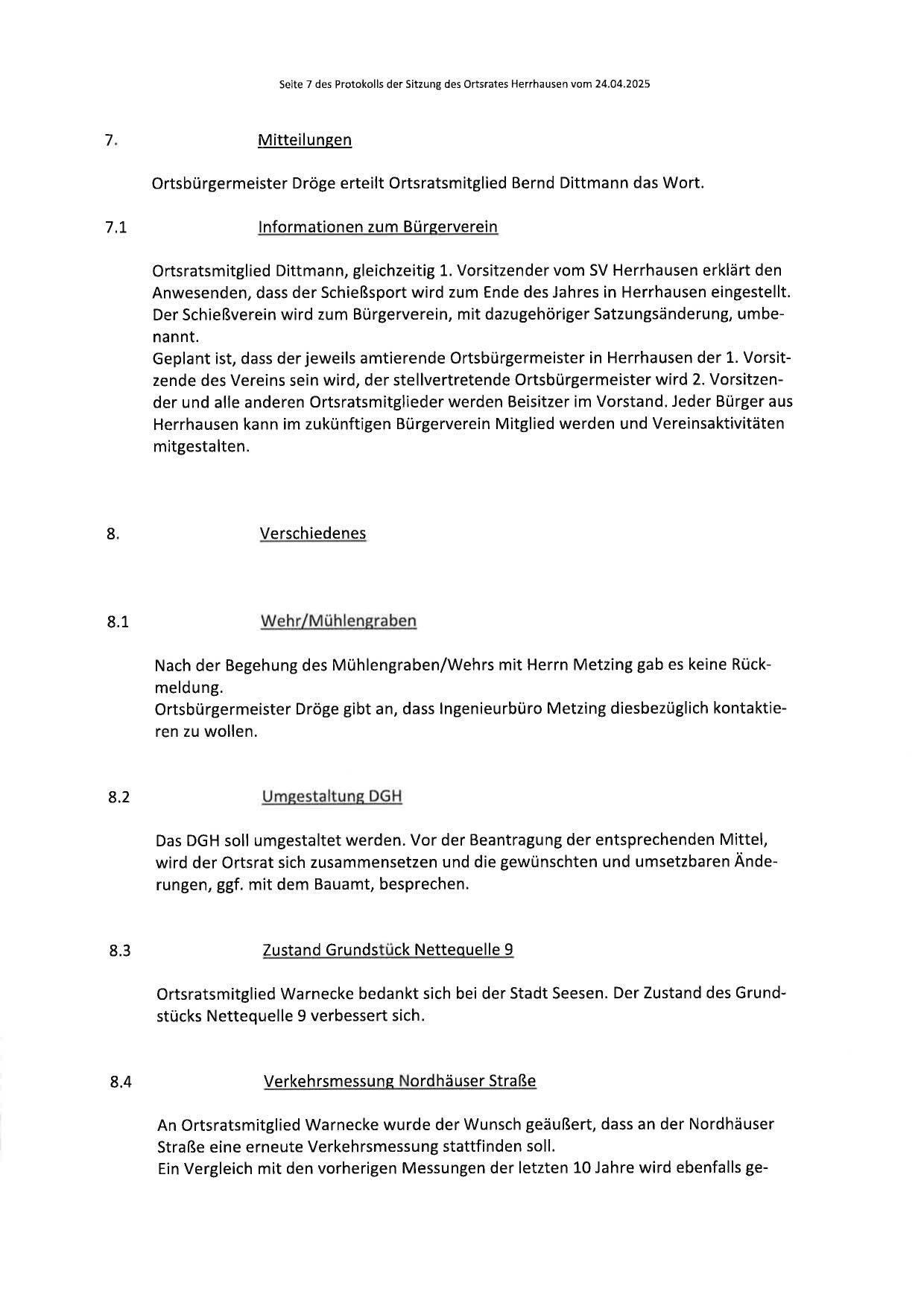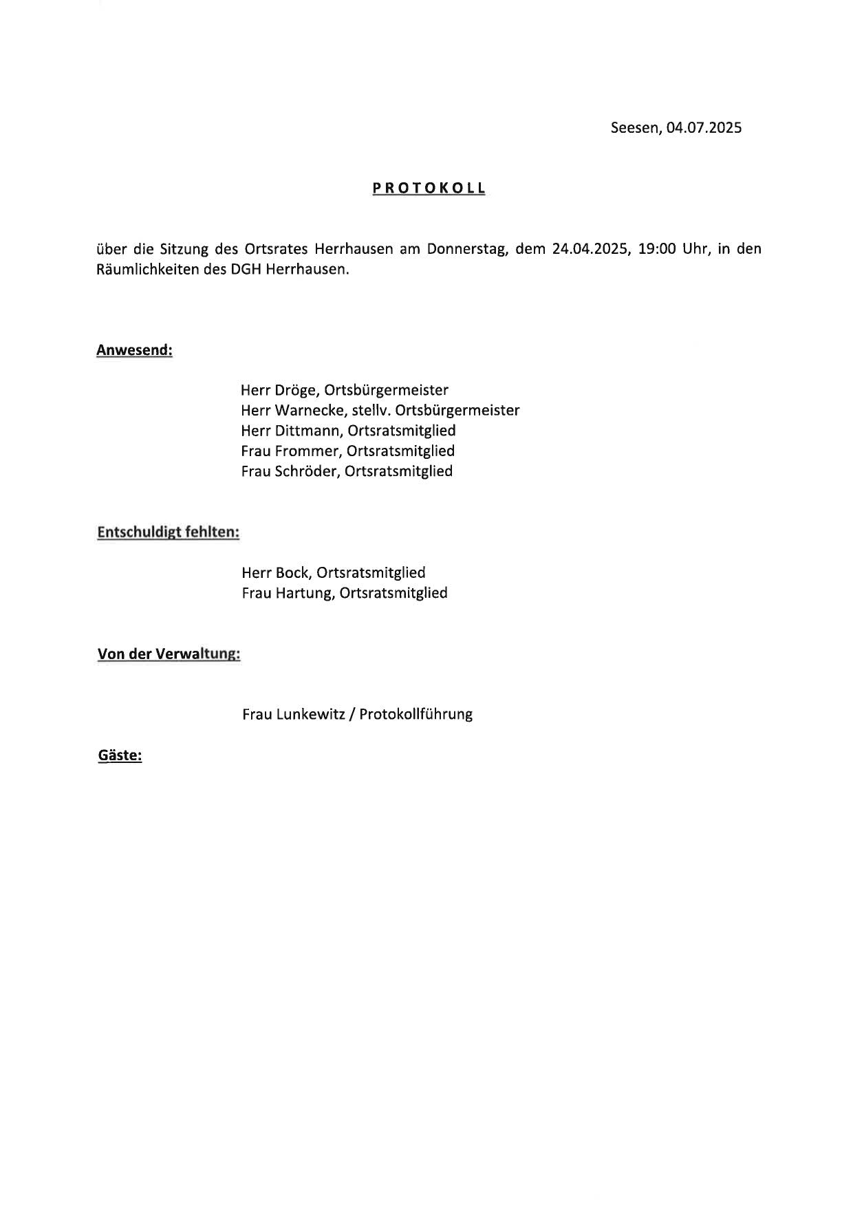 Protokoll über die Sitzung des Ortsrates Herrhausen am Dienstag, dem 24.04.2025, 19:30 Uhr, in der Gaststätte "Zur Traube".