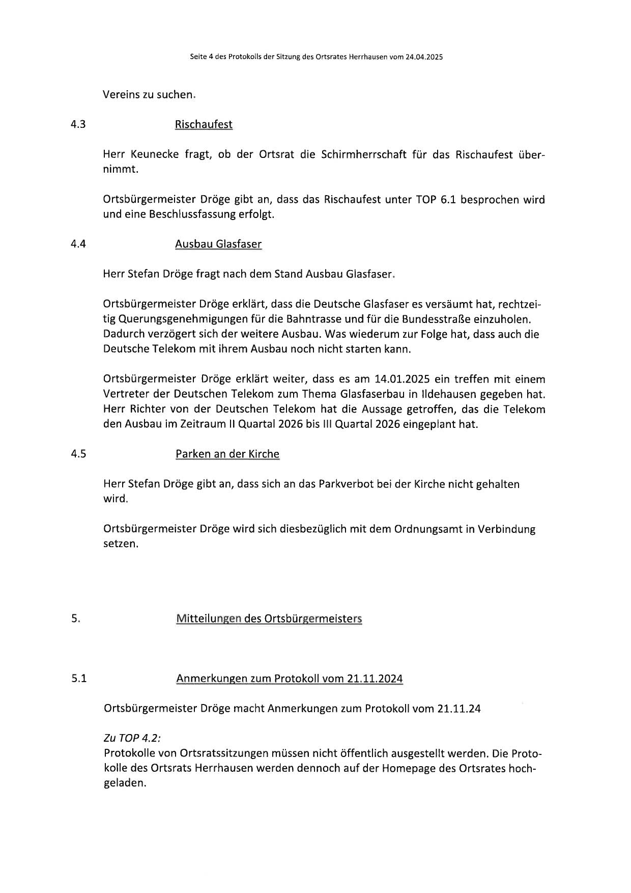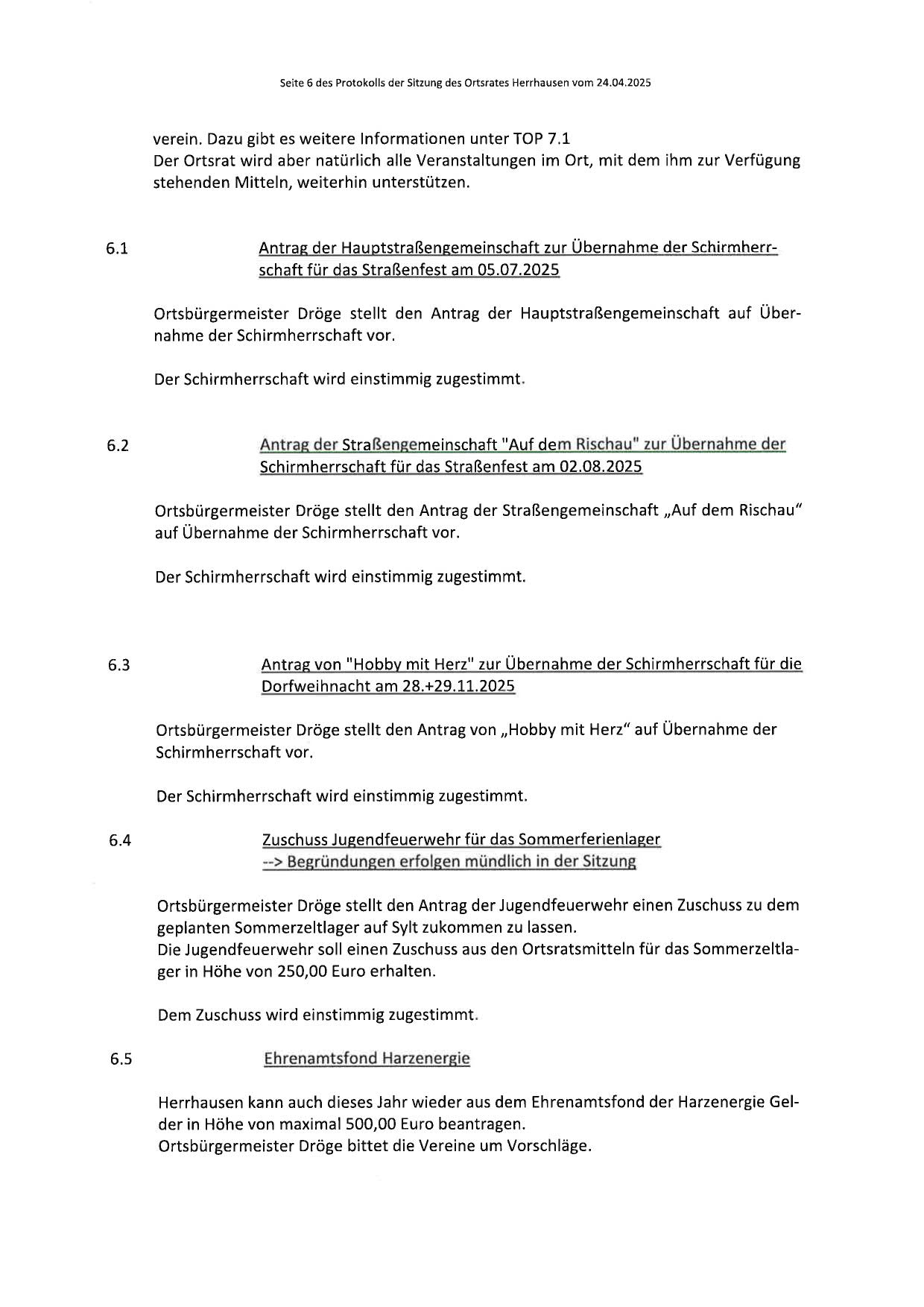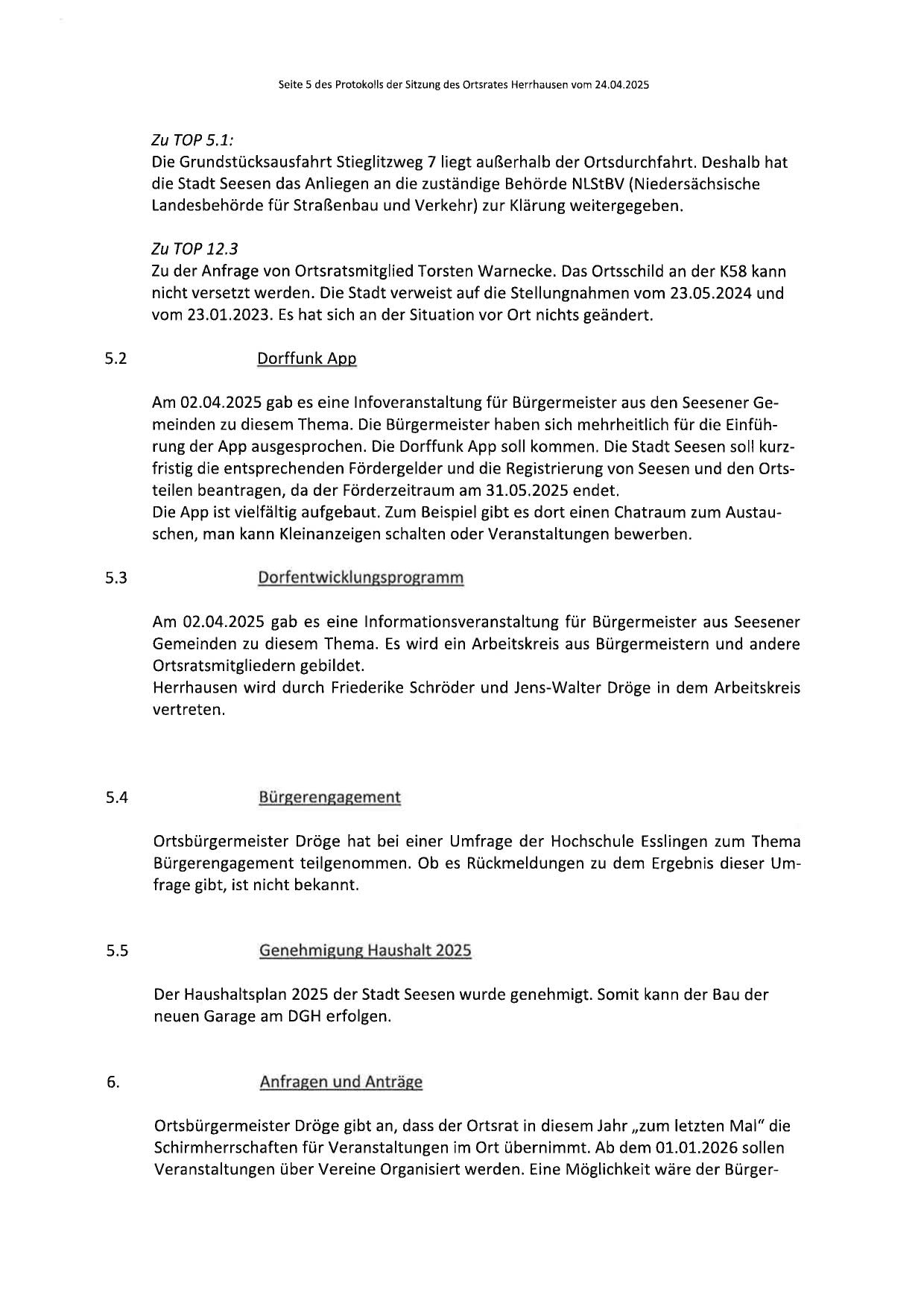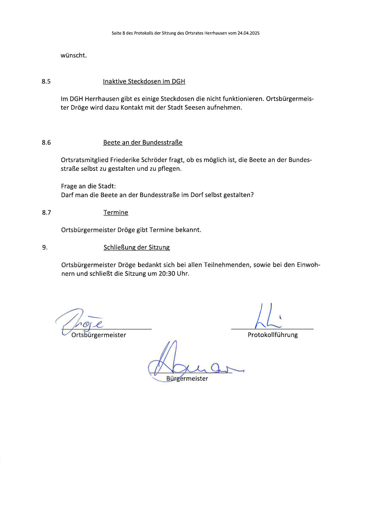 Protokoll über die Sitzung des Ortsrates Herrhausen am Dienstag, dem 24.04.2025, 19:30 Uhr, in der Gaststätte "Zur Traube".
