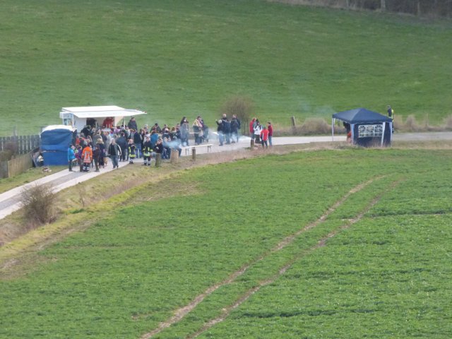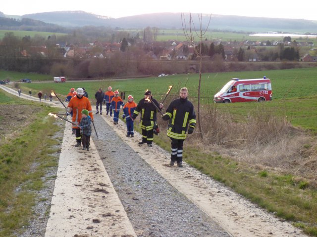 Um 19.30 Uhr startete die Jugendfeuerwehr mit ihrem alljährliche Fackelzug zum Osterfeuerplatz "Auf den Hainholz" um das Feuer zu entzünden. Währenddessen wurden die Besucher mit Speis und Trank an der Nettequelle versorgt. Trotz der kalten Witterung waren wieder viele Gäste gekommen um sich bei herrlicher Sicht das Osterfeuer anzuschauen und sich in gemütlicher Atmosphäre untereinander auszutauschen.