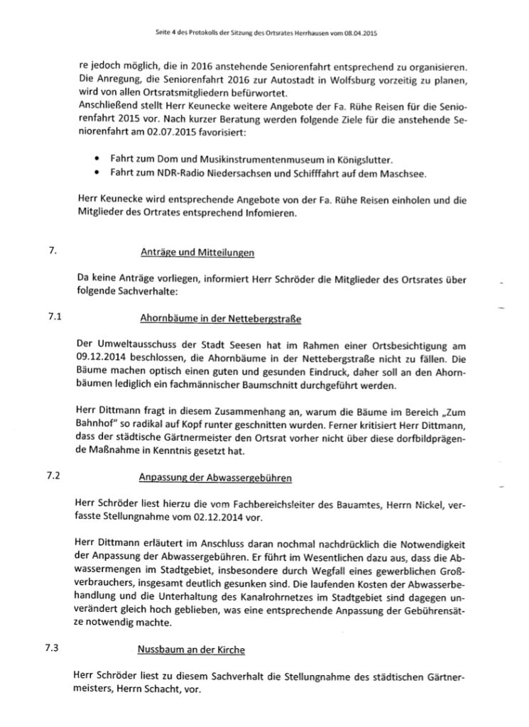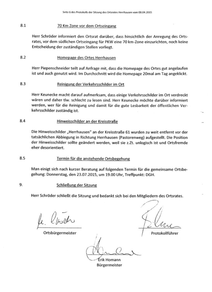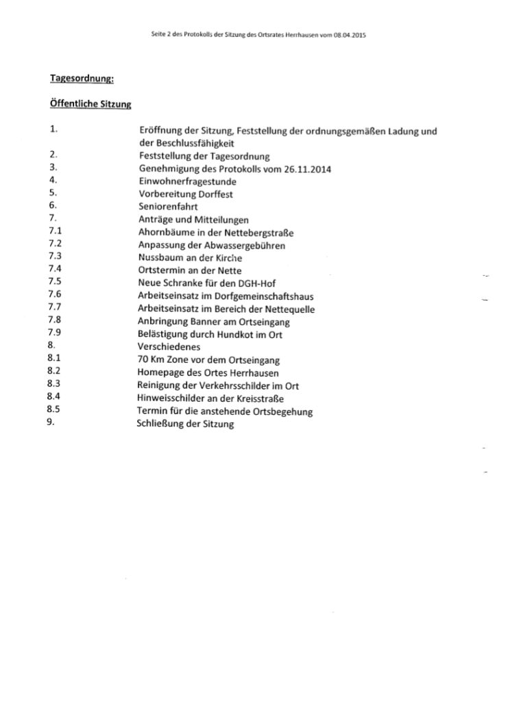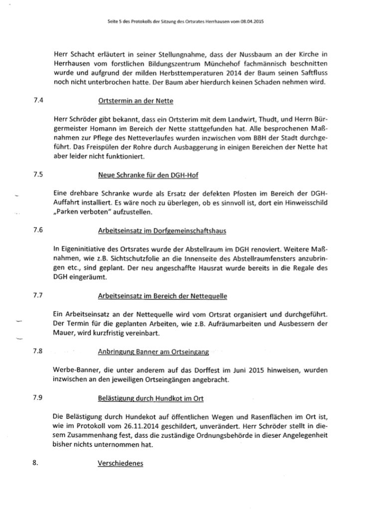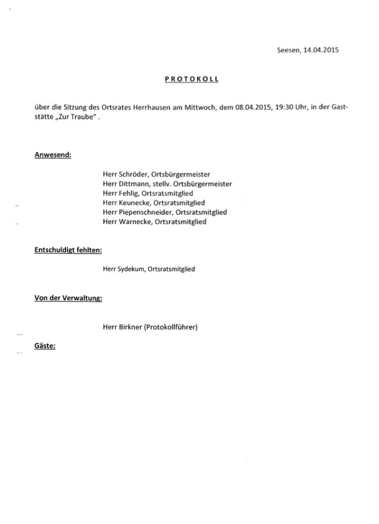 Protokoll über die Sitzung des Ortsrates Herrhausen am Mittwoch, dem 08.04.2015, 19:30 Uhr, in der Gaststätte "Zur Traube".