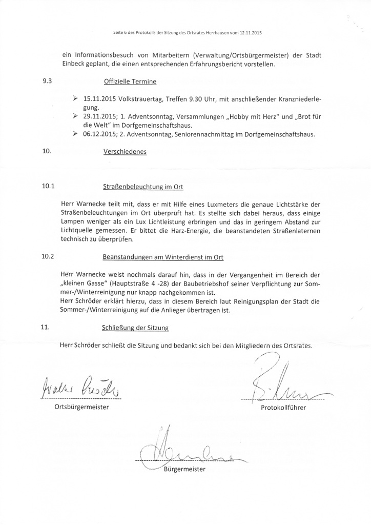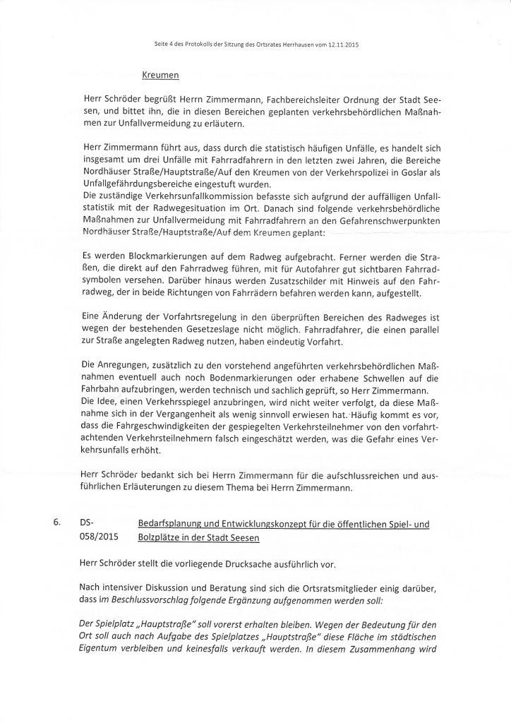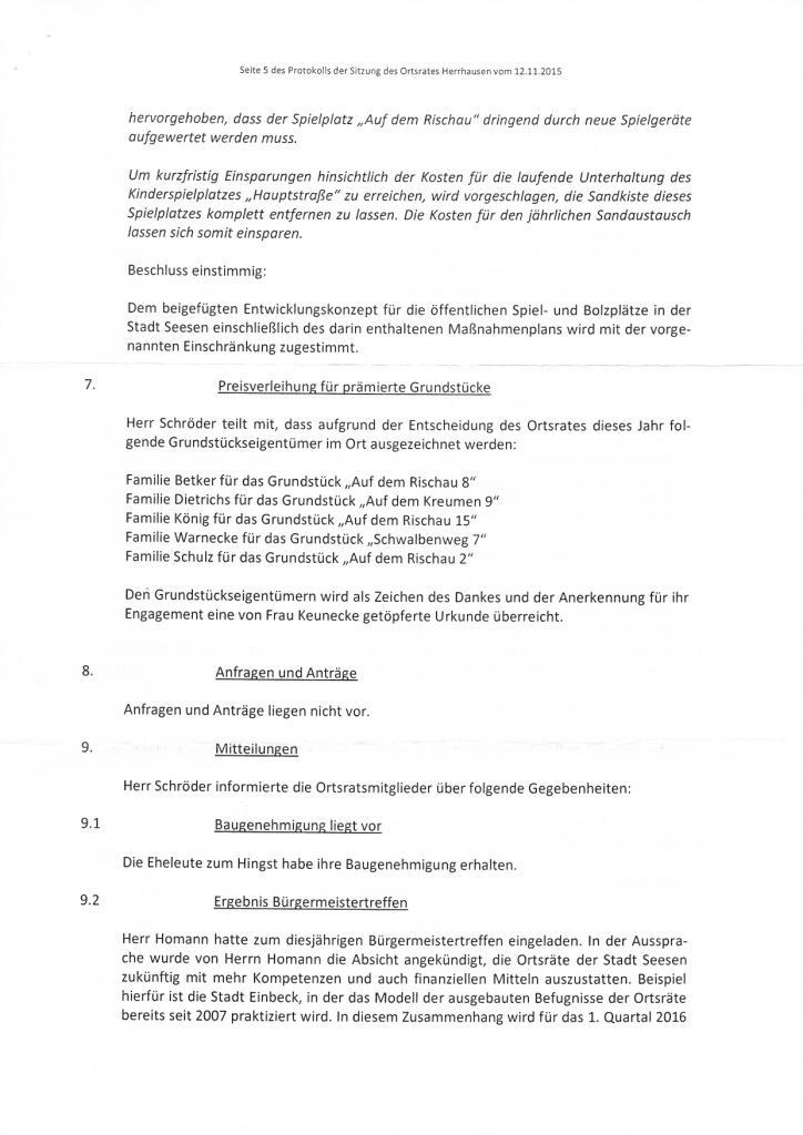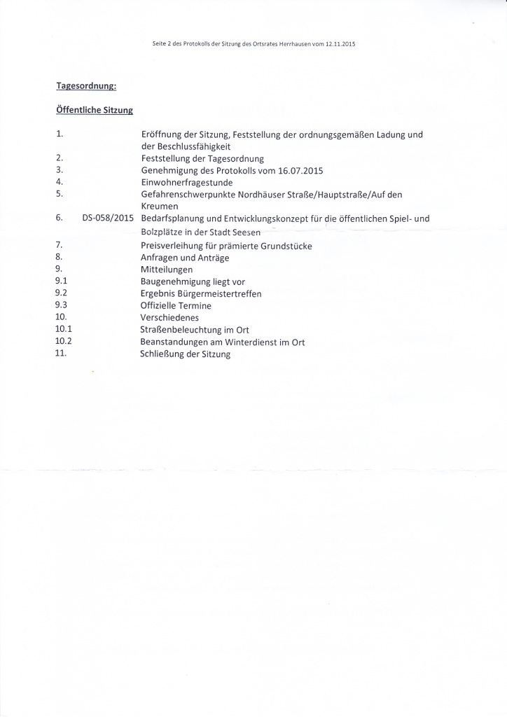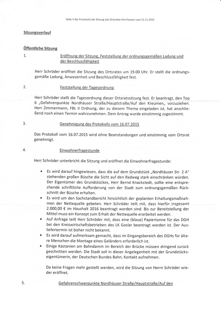 Protokoll über die Sitzung des Ortsrates Herrhausen am Donnerstag, dem 12.11.2015, 19:00 Uhr, in der Gaststätte "Zur Traube".