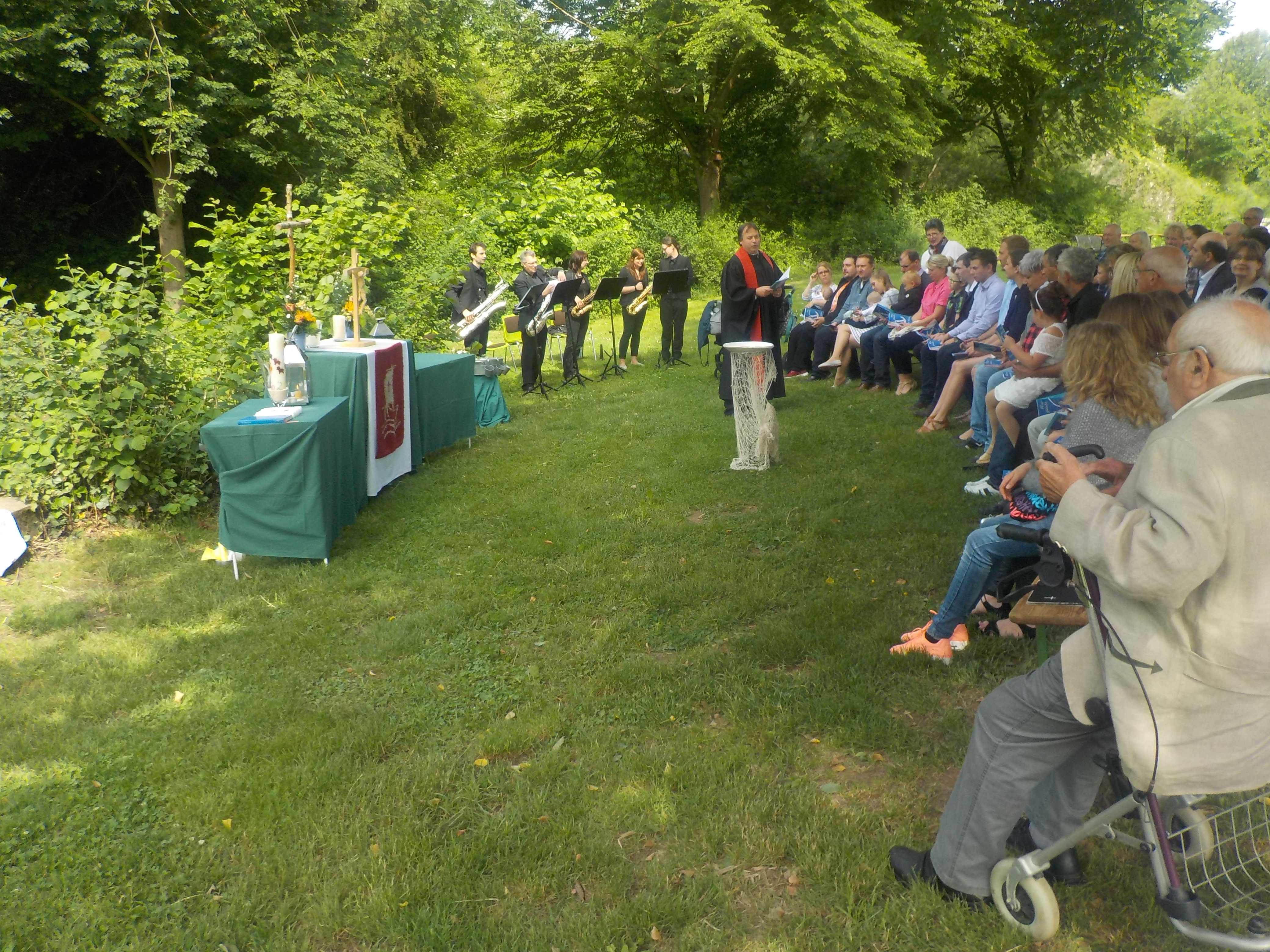 In diesem Gottesdienst hat Pfarrer Hans-Dieter Scheipner 5 junge Menschen, darunter eine Konfirmandin sowie Zwillingsbabys mit Wasser direkt aus der Nettequelle getauft. "Gott gab uns Atem, damit wir leben". Das Saxofonensemble "Elke auf dem Holzweg" wusste gekonnt den Gottesdienst musikalisch zu umrahmen. Bei Leonard Cohens "Hallelujah" kam Gänsehaut auf ("Danke für diesen guten Morgen").