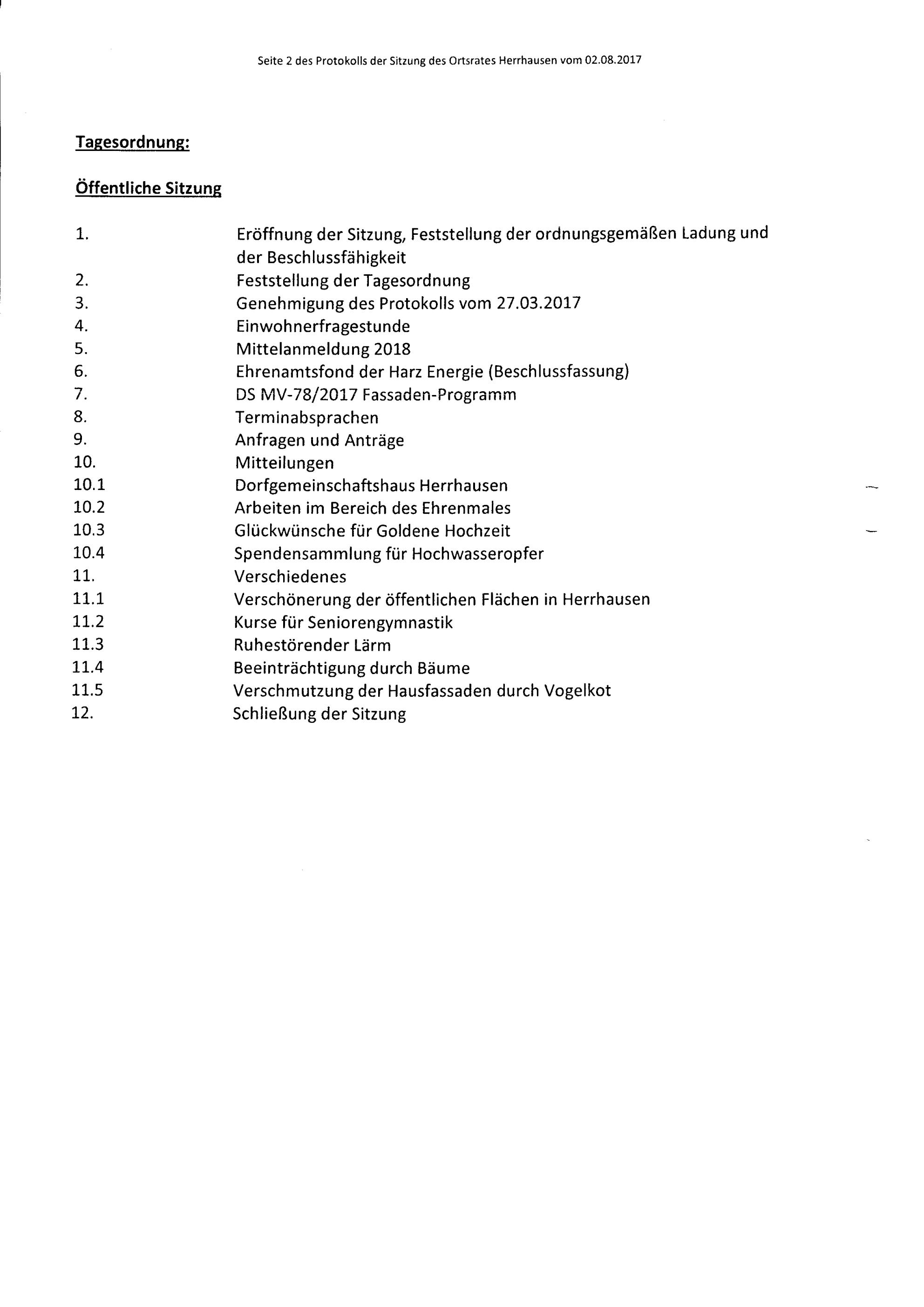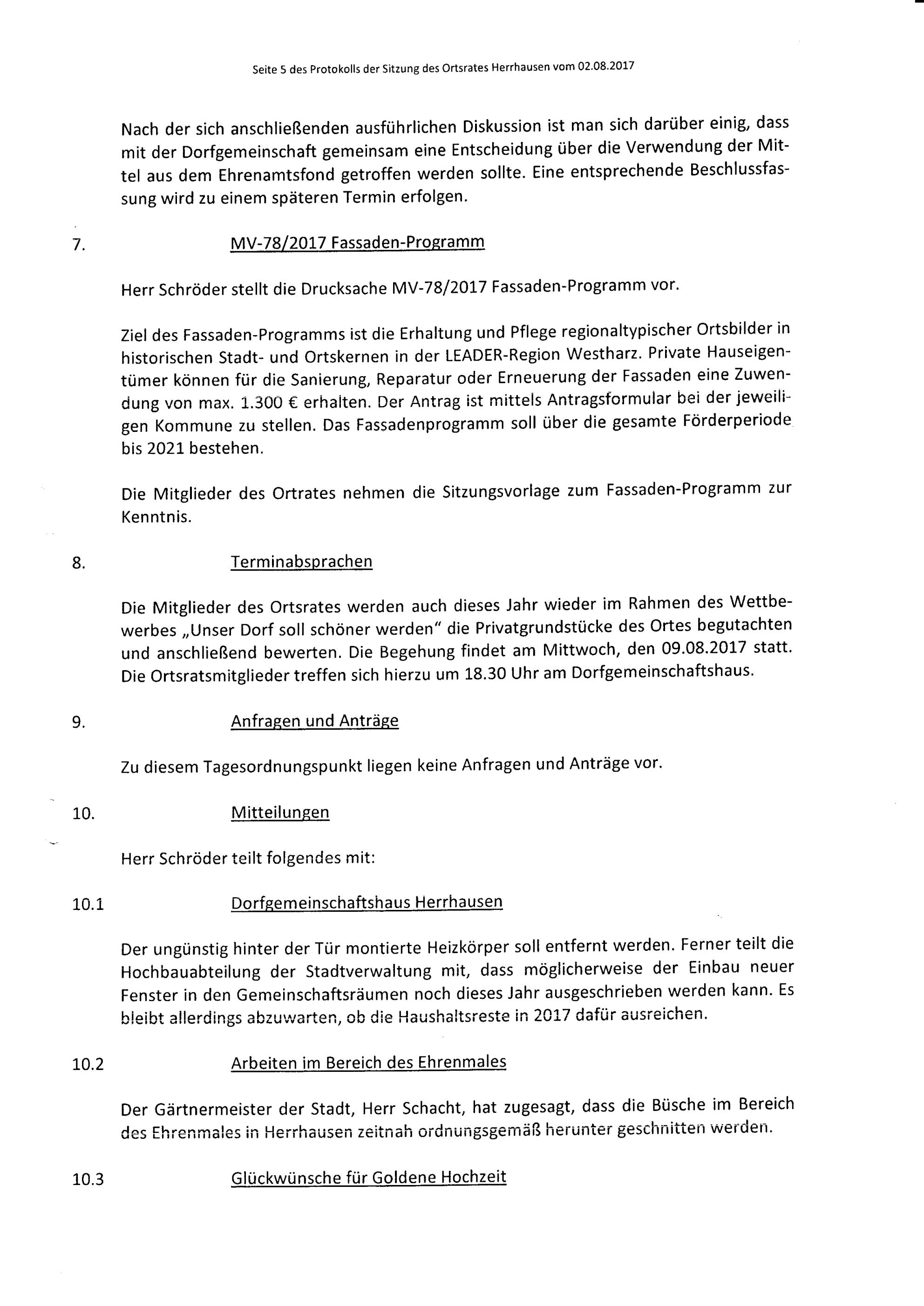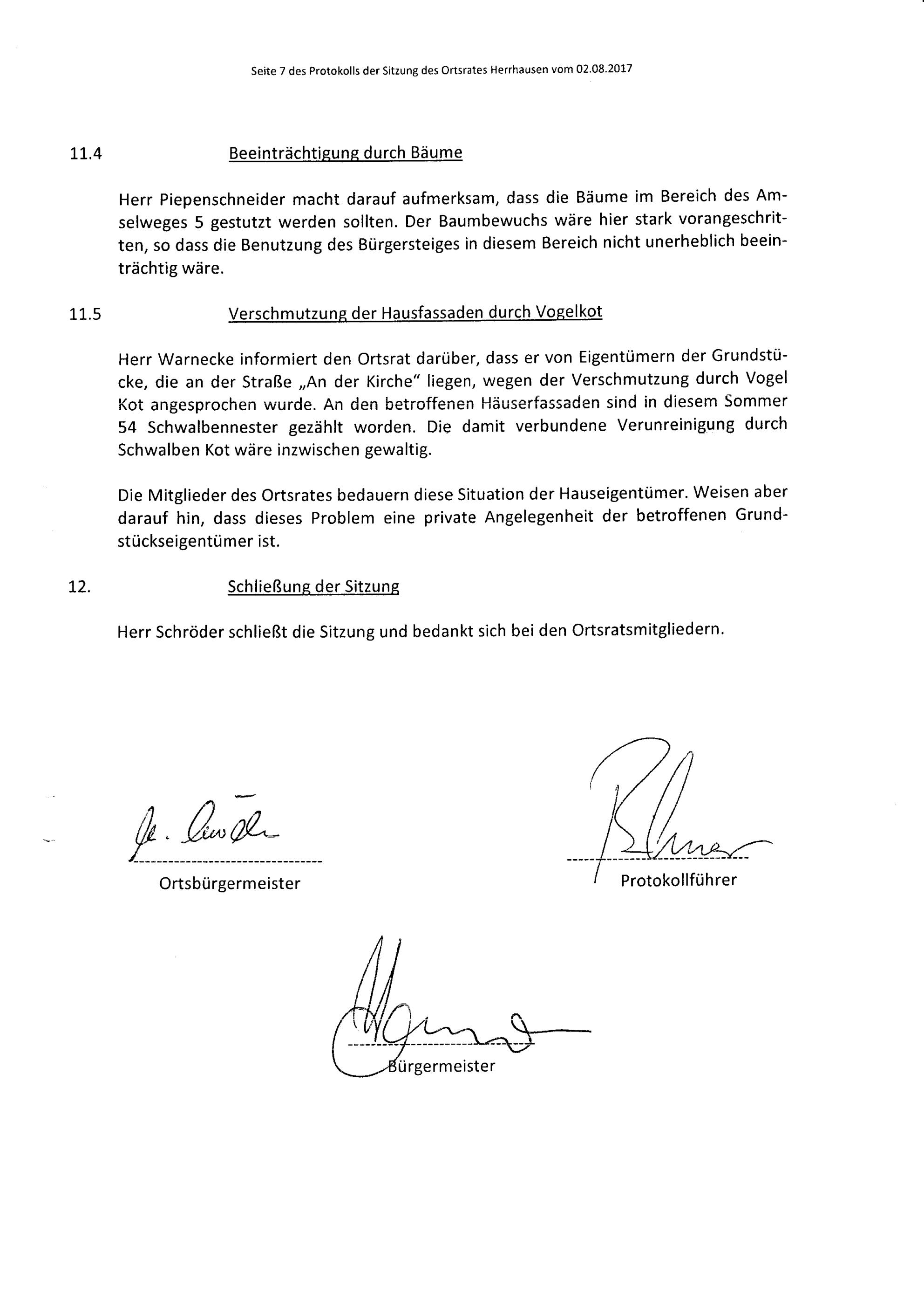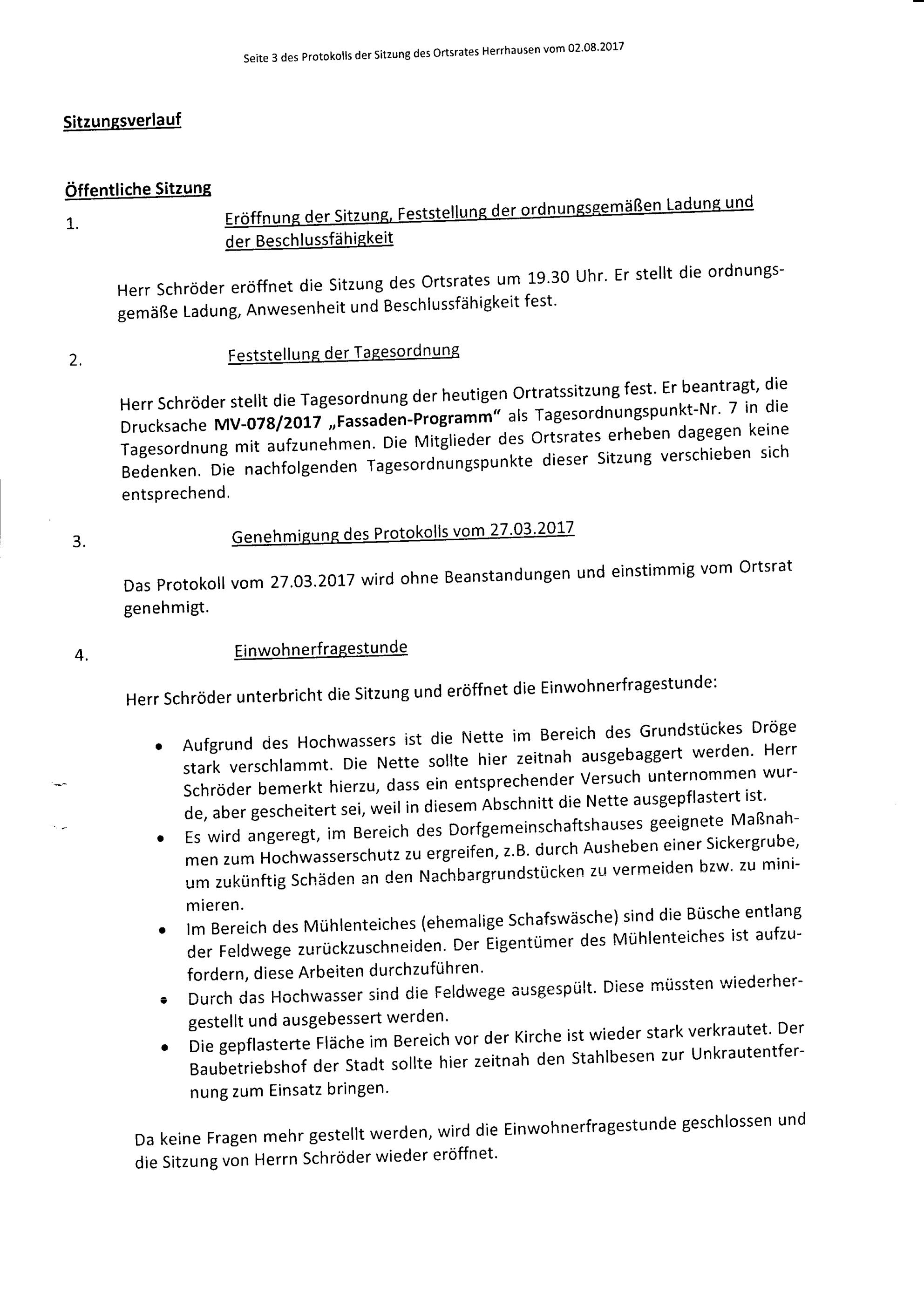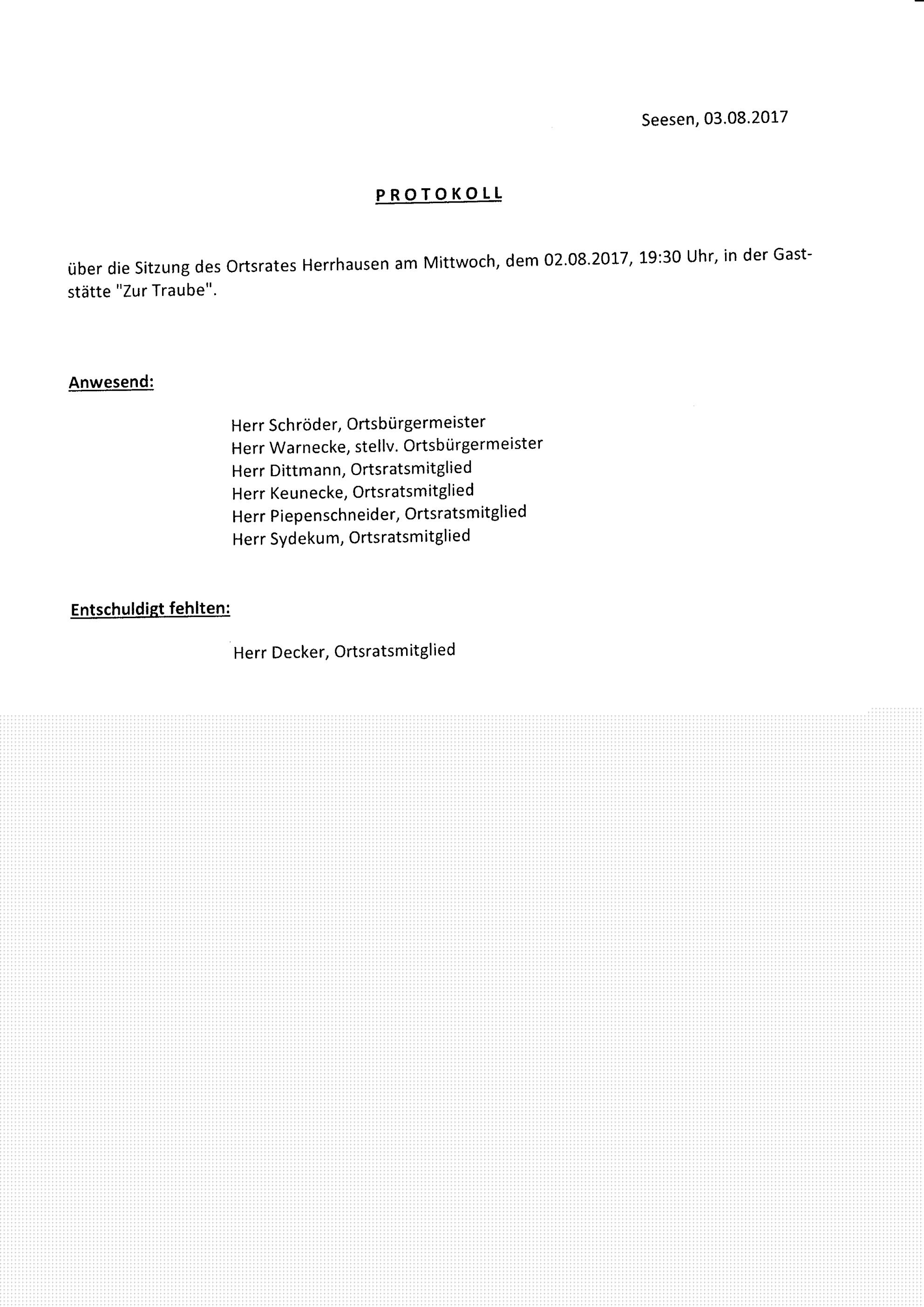 Protokoll über die Sitzung des Ortsrates Herrhausen am Mittwoch, dem 02.08.2017, 19:30 Uhr, in der Gaststätte "Zur Traube".