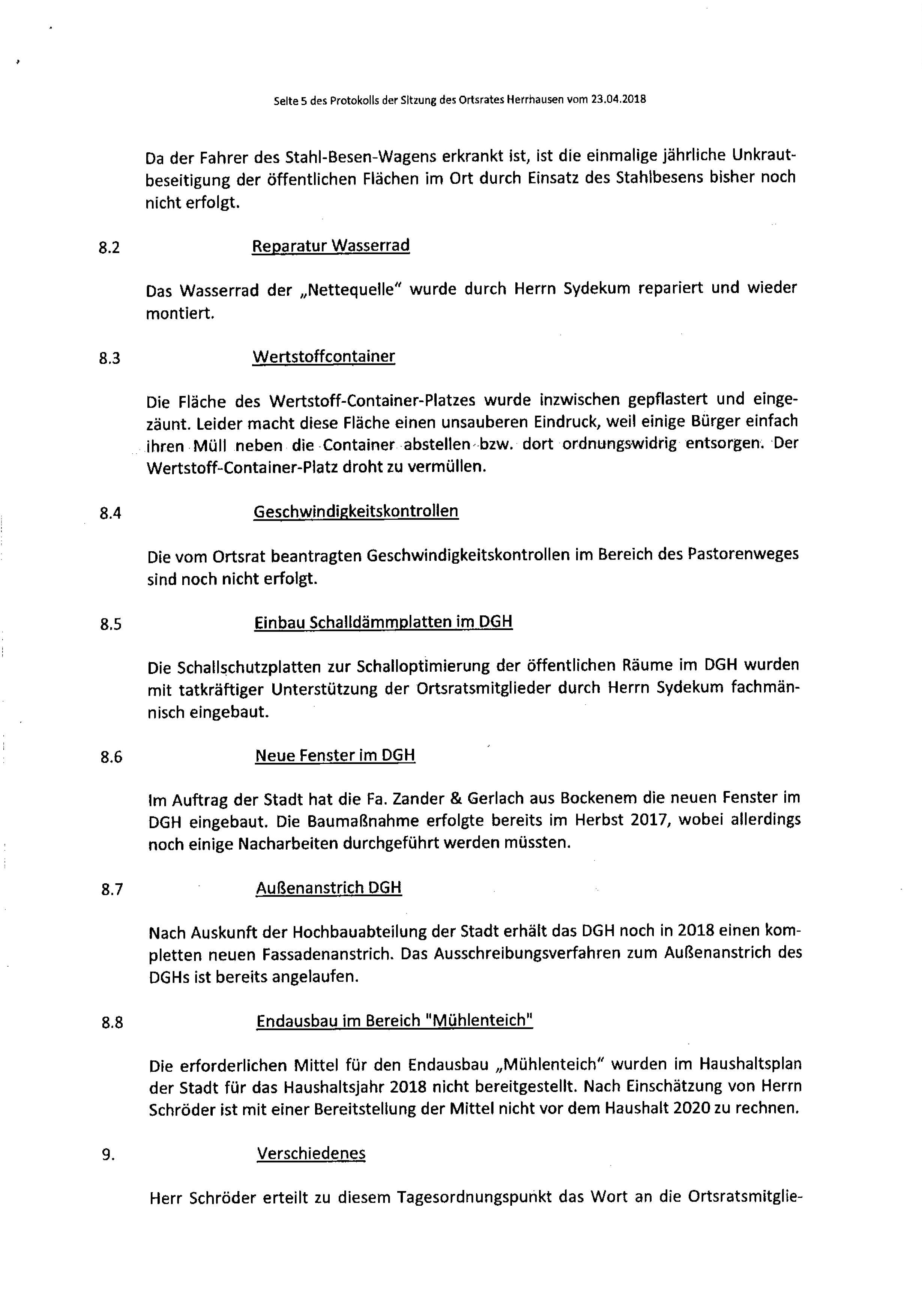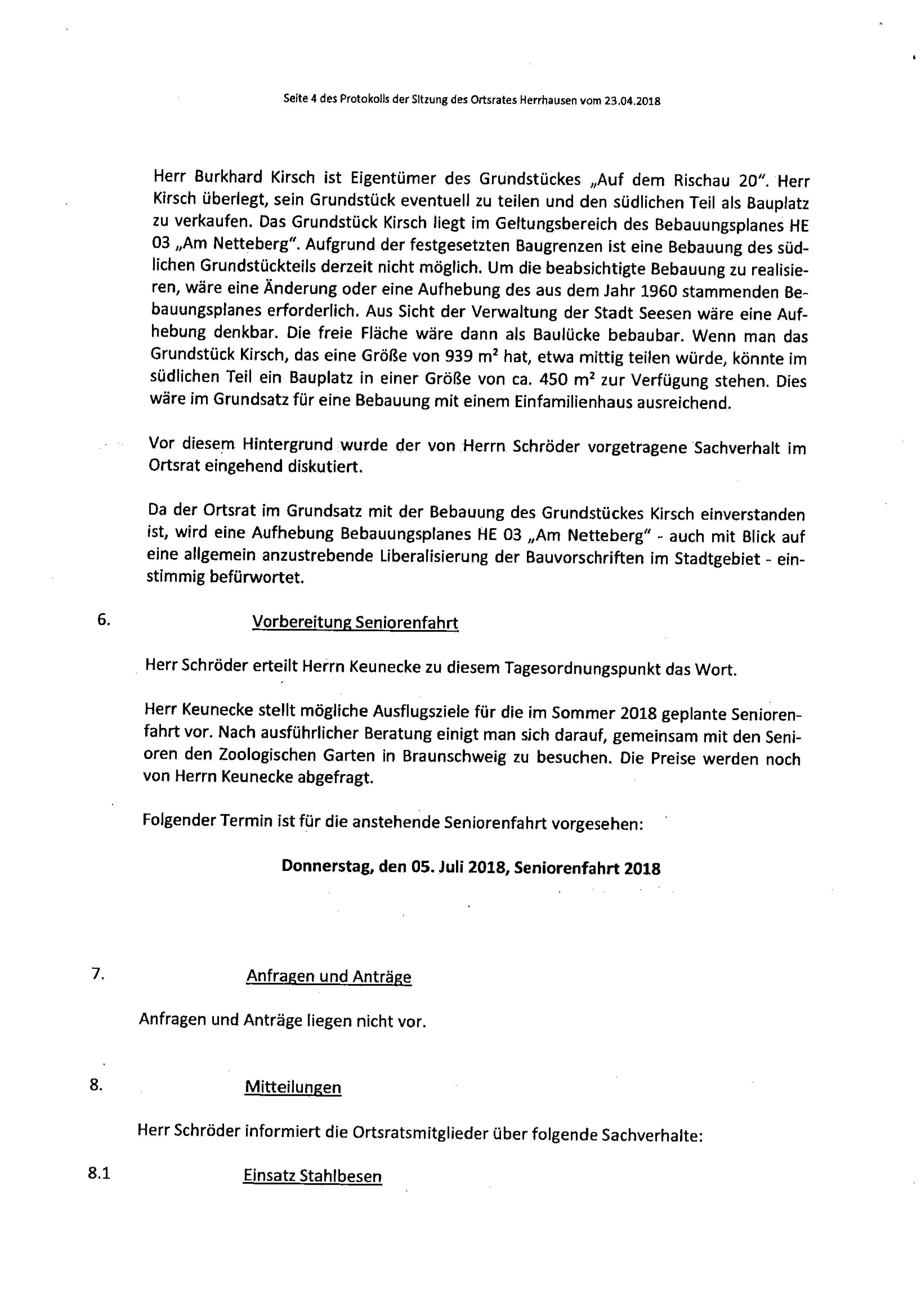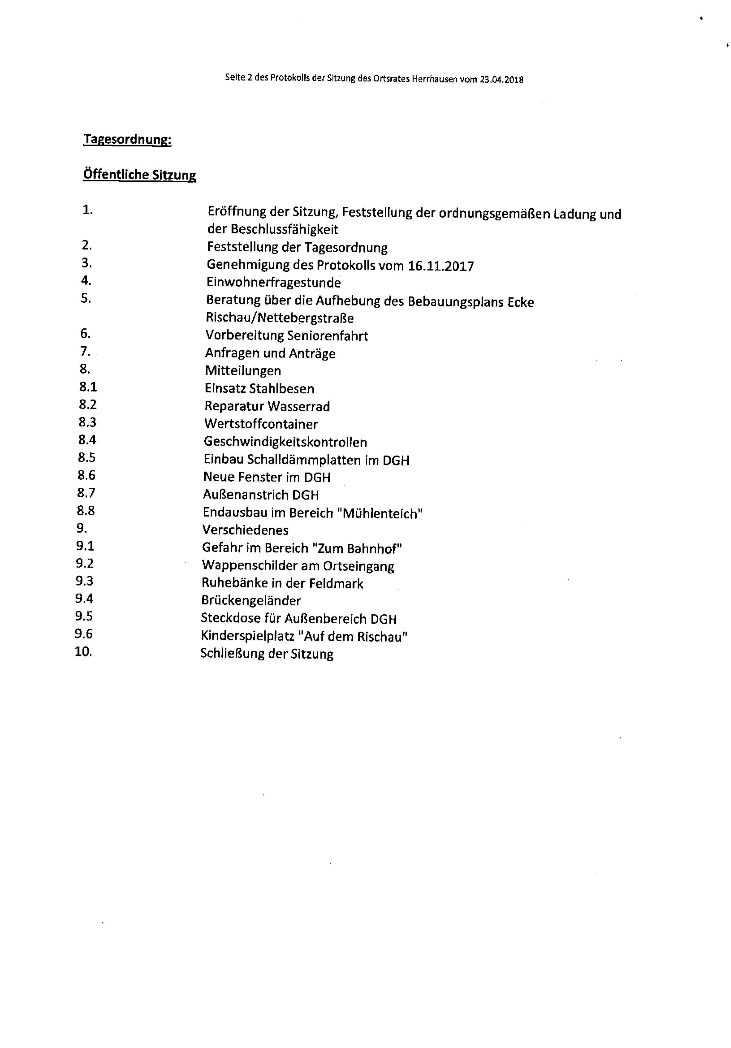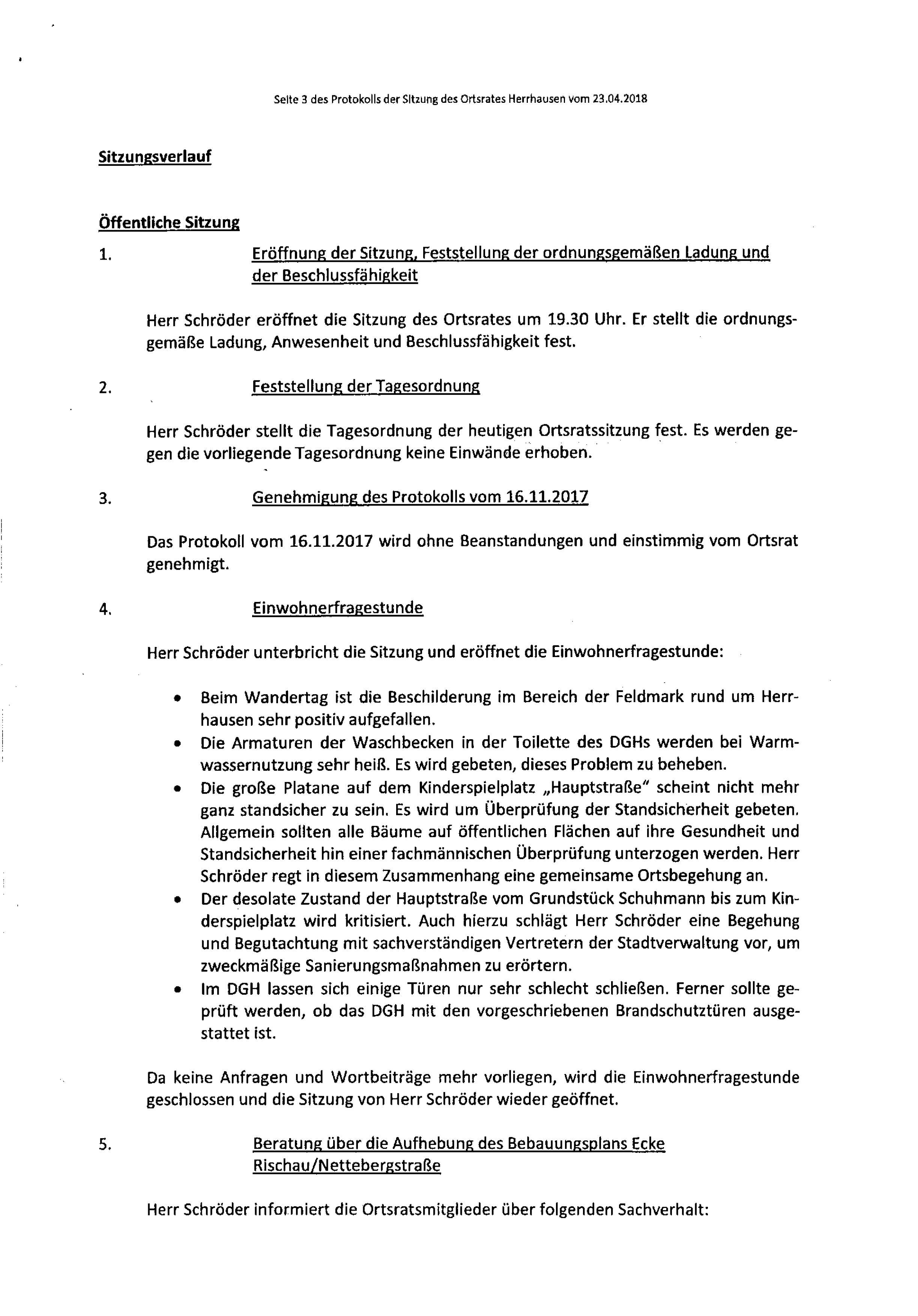 Protokoll über die Sitzung des Ortsrates Herrhausen am Donnerstag, dem 23.04.2018, 19:30 Uhr, in der Gaststätte "Zur Traube".