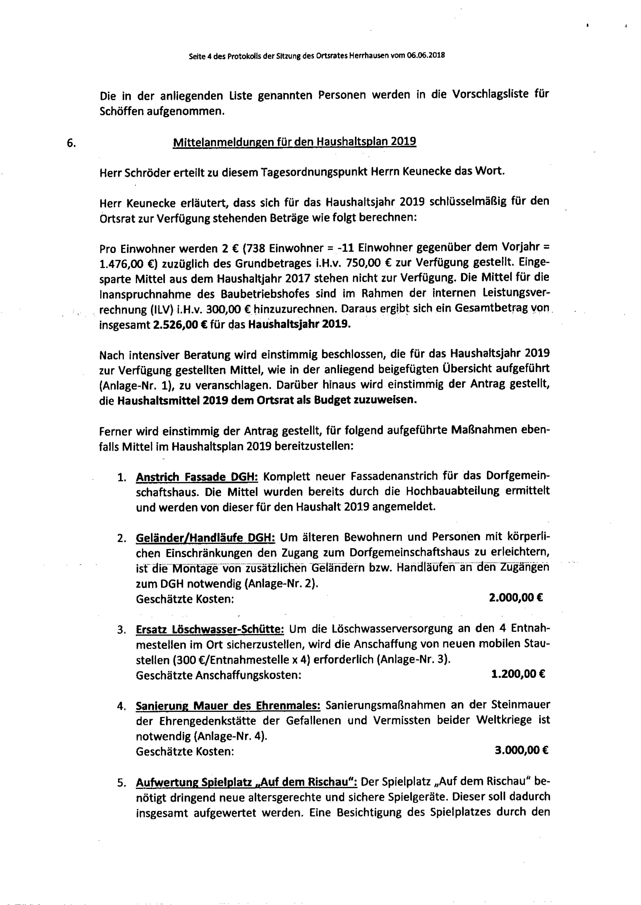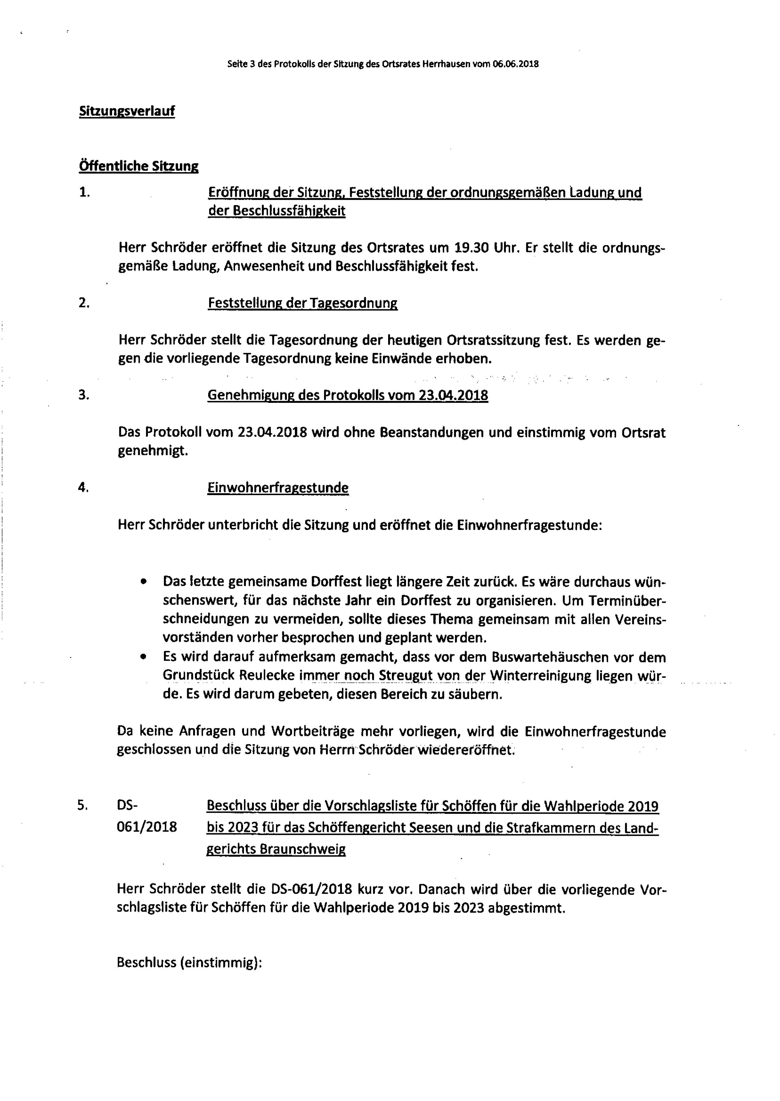 Protokoll über die Sitzung des Ortsrates Herrhausen am Donnerstag, dem 06.06.2018, 19:30 Uhr, in der Gaststätte "Zur Traube".