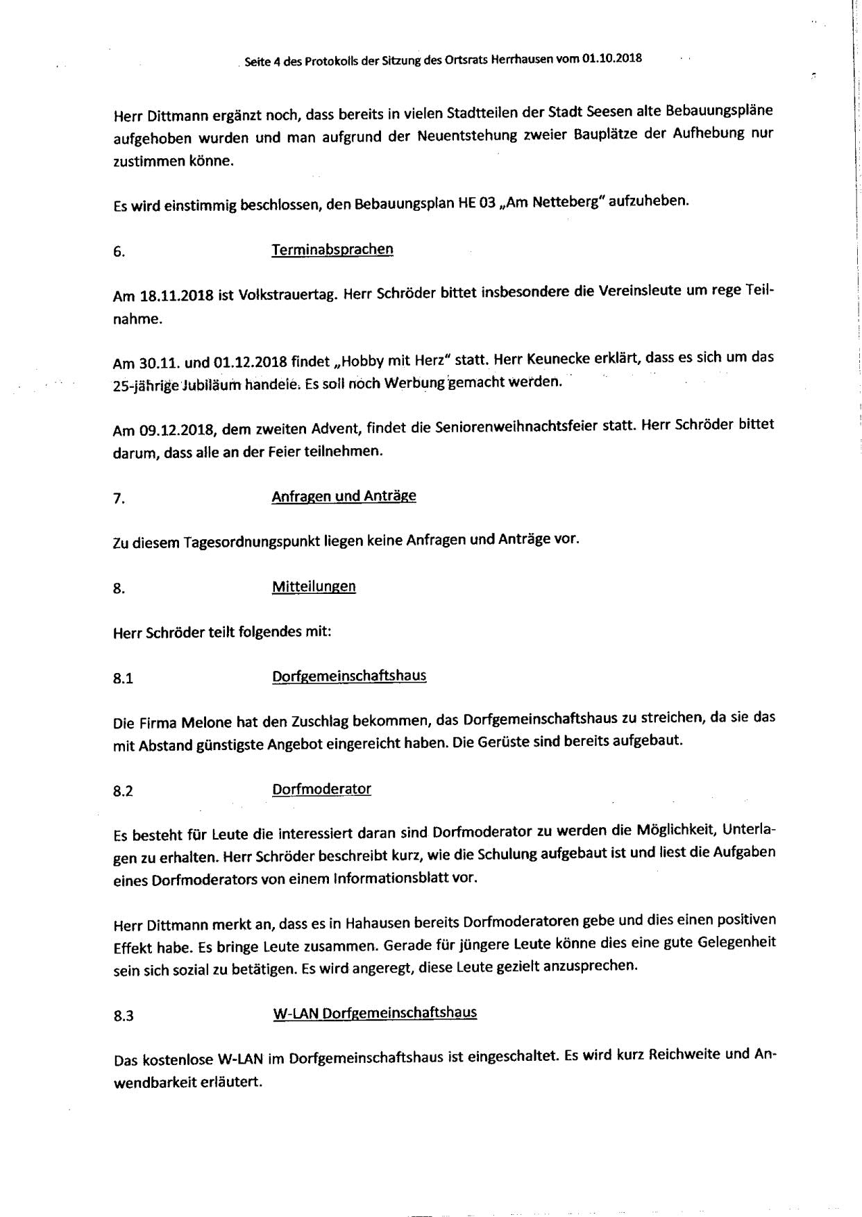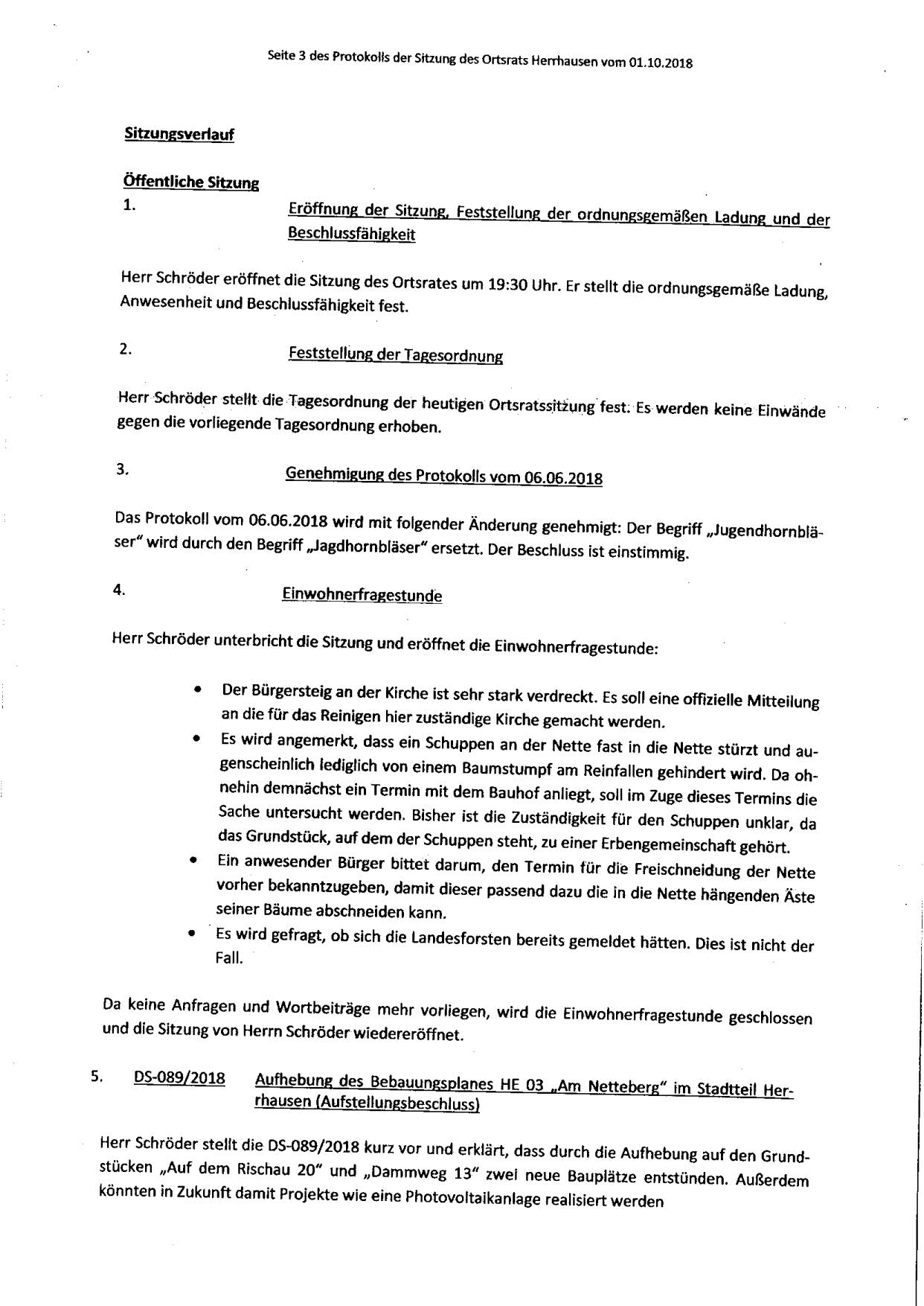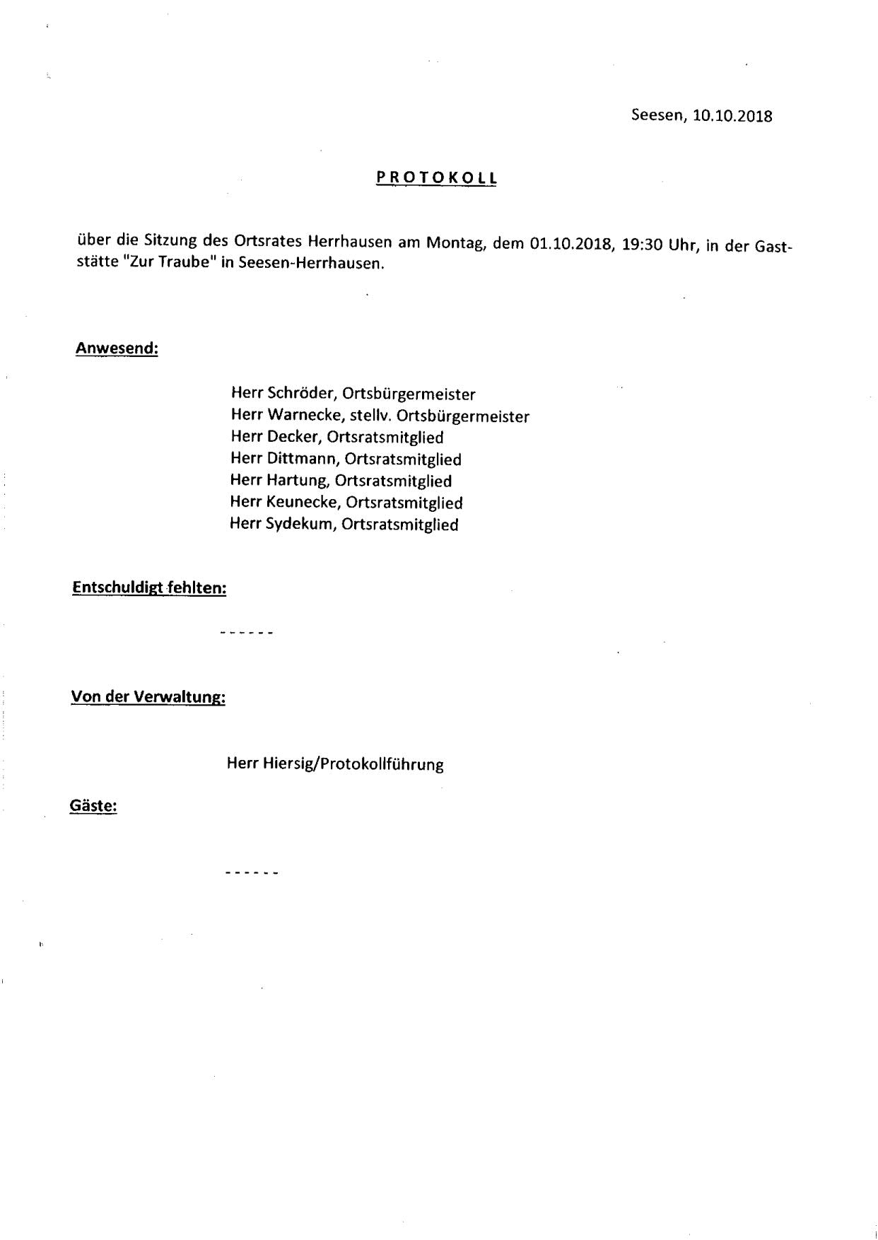 Protokoll über die Sitzung des Ortsrates Herrhausen am Montag, dem 01.10.2018, 19:30 Uhr, in der Gaststätte "Zur Traube".