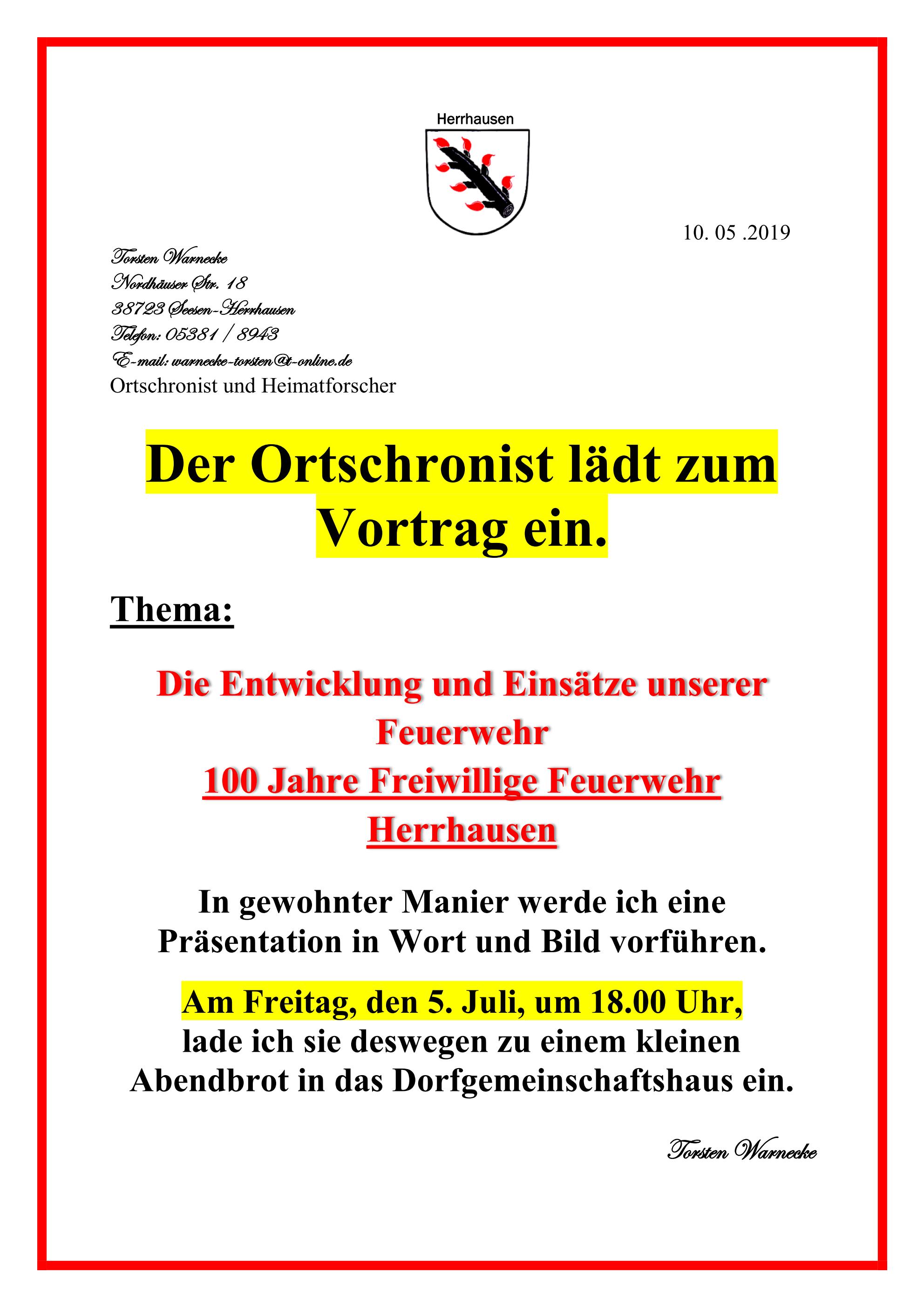Am Freitag den 5. Juli lädt der Ortschronist zu einem Vortrag zum Thema Entwicklung und Einsätze unserer