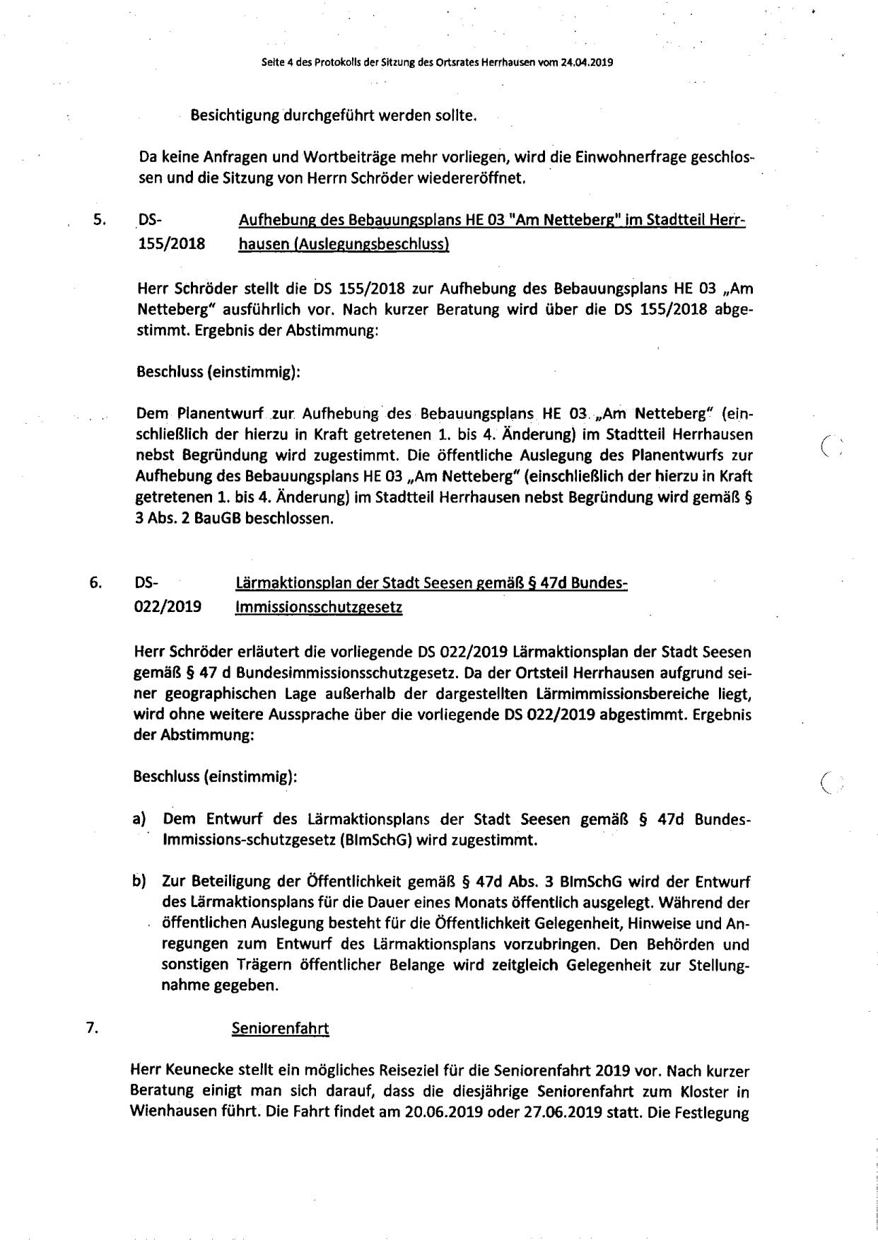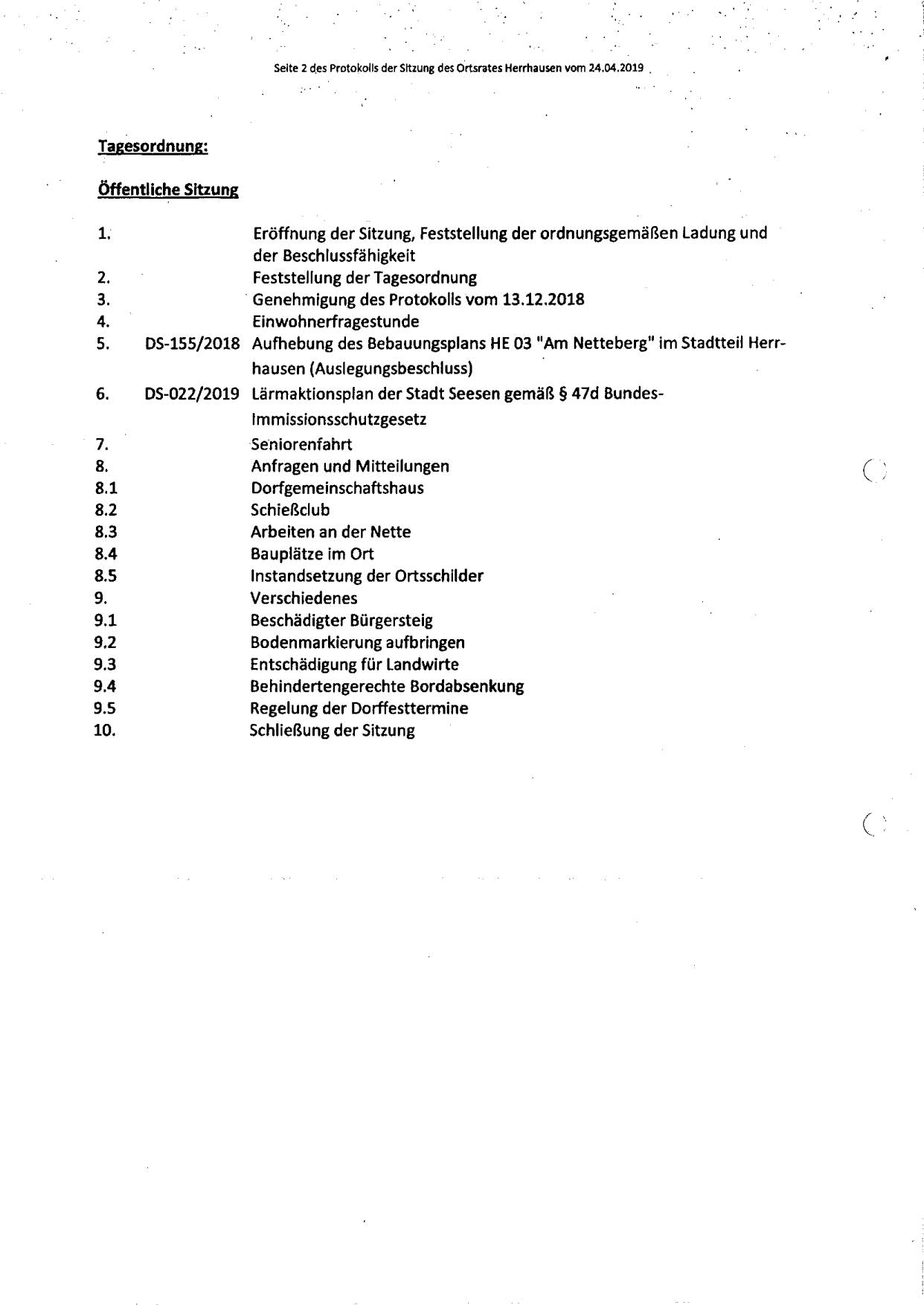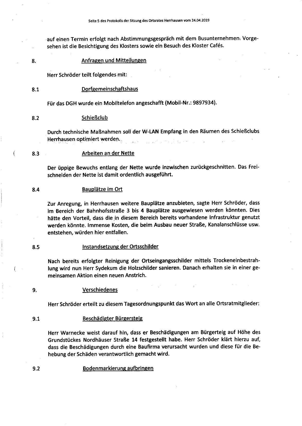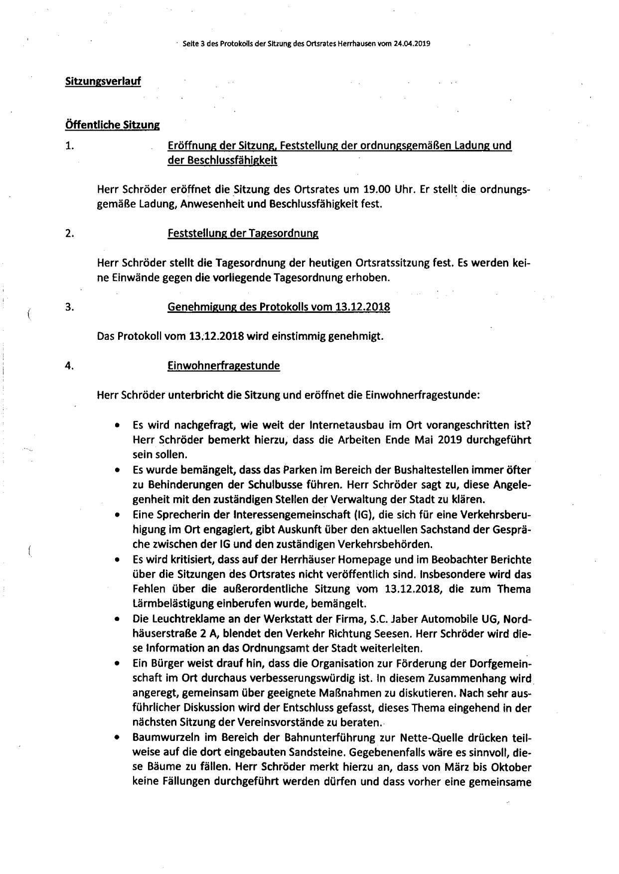 Protokoll über die Sitzung des Ortsrates Herrhausen am Dienstag, dem 25.04.2019, 19:00 Uhr, in der Gaststätte "Zur Traube".