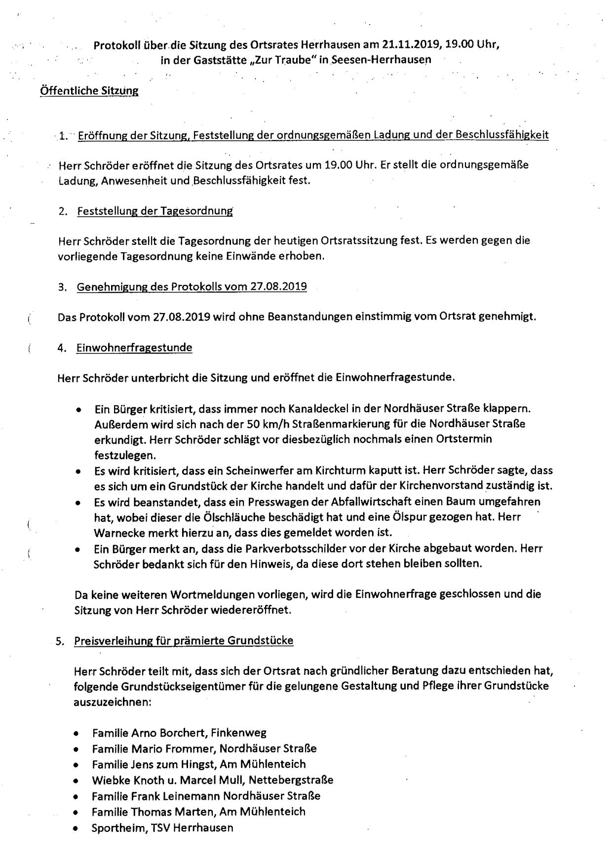 Protokoll über die Sitzung des Ortsrates Herrhausen am Dienstag, dem 21.11.2019, 19:00 Uhr, in der Gaststätte "Zur Traube".