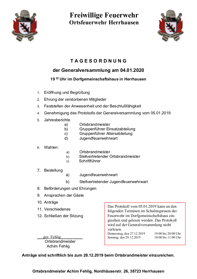 Um ein Verlesen der Protokolle auf den Versammlungen zu vermeiden, liegen die Protokolle am 27.12.2019 von 19:00 bis 20:00 Uhr und am 29.12.2019 von 10:00 bis 11:00 Uhr öffentlich im Schulungsraum der Feuerwehr im Dorfgemeinschaftshaus Herrhausen aus.