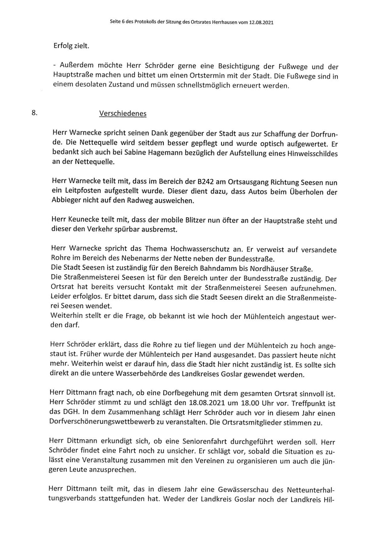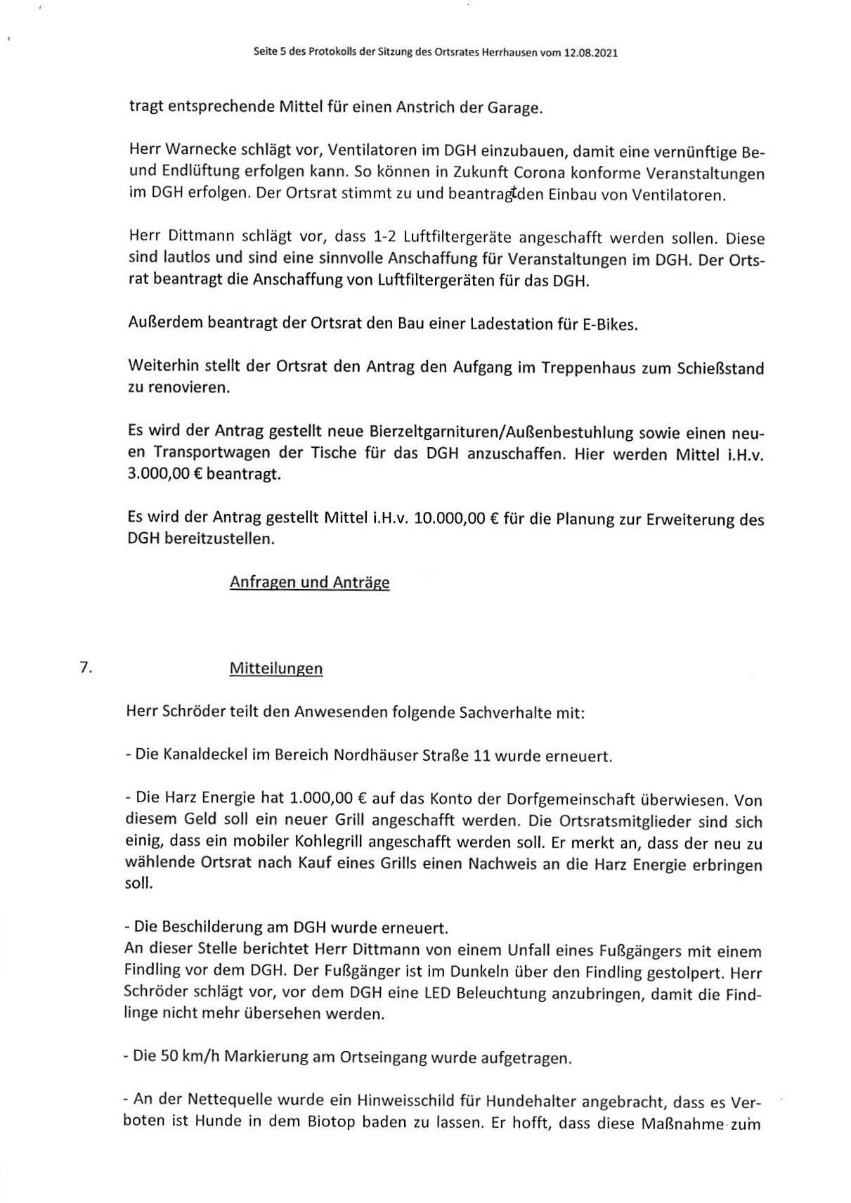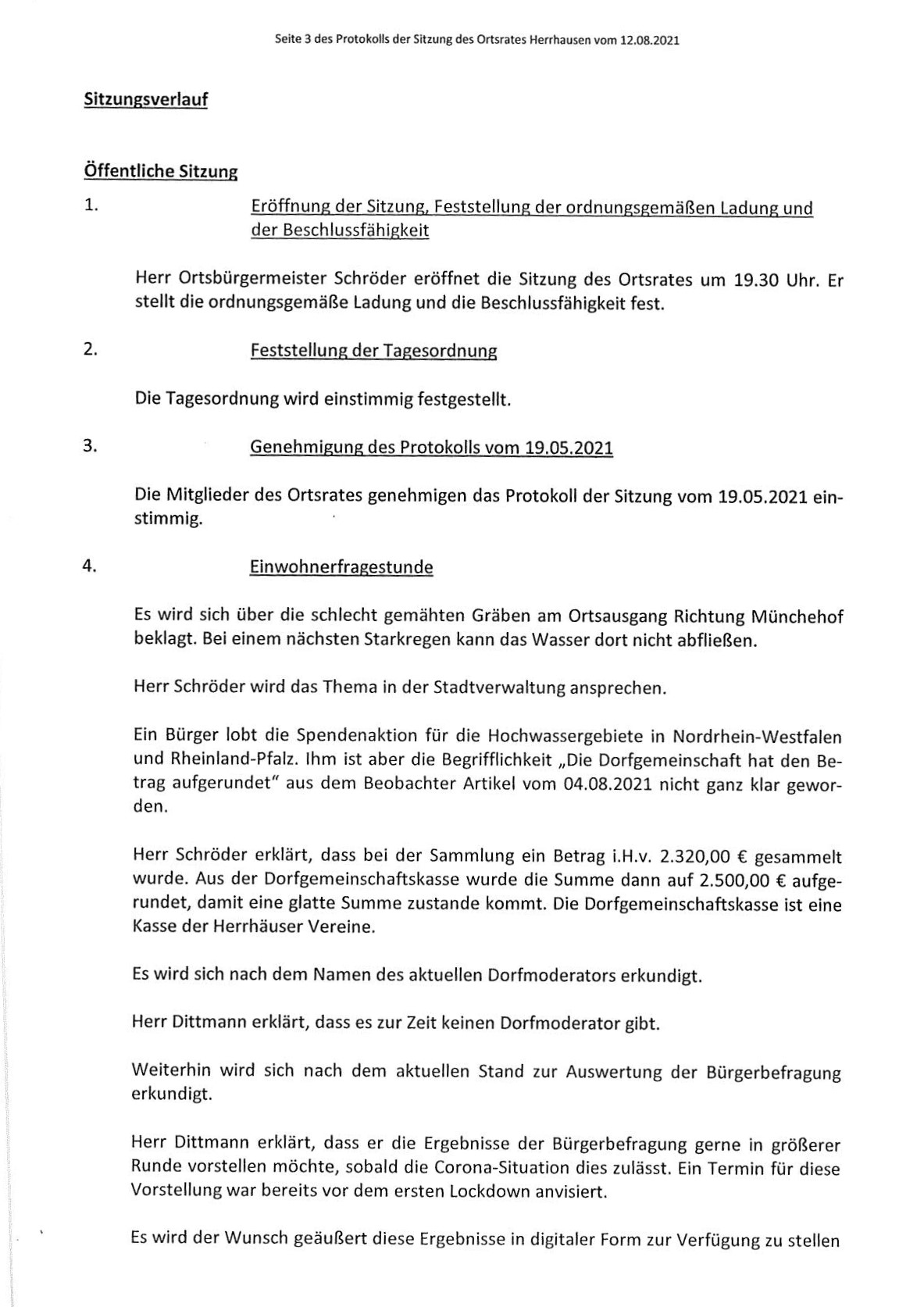 Protokoll über die Sitzung des Ortsrates Herrhausen am Donnerstag, dem 12.08.2021, 19:30 Uhr, in der Gaststätte "Zur Traube".